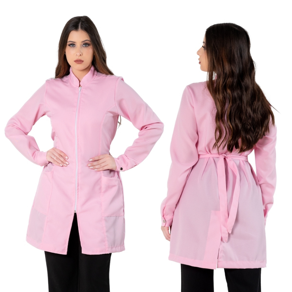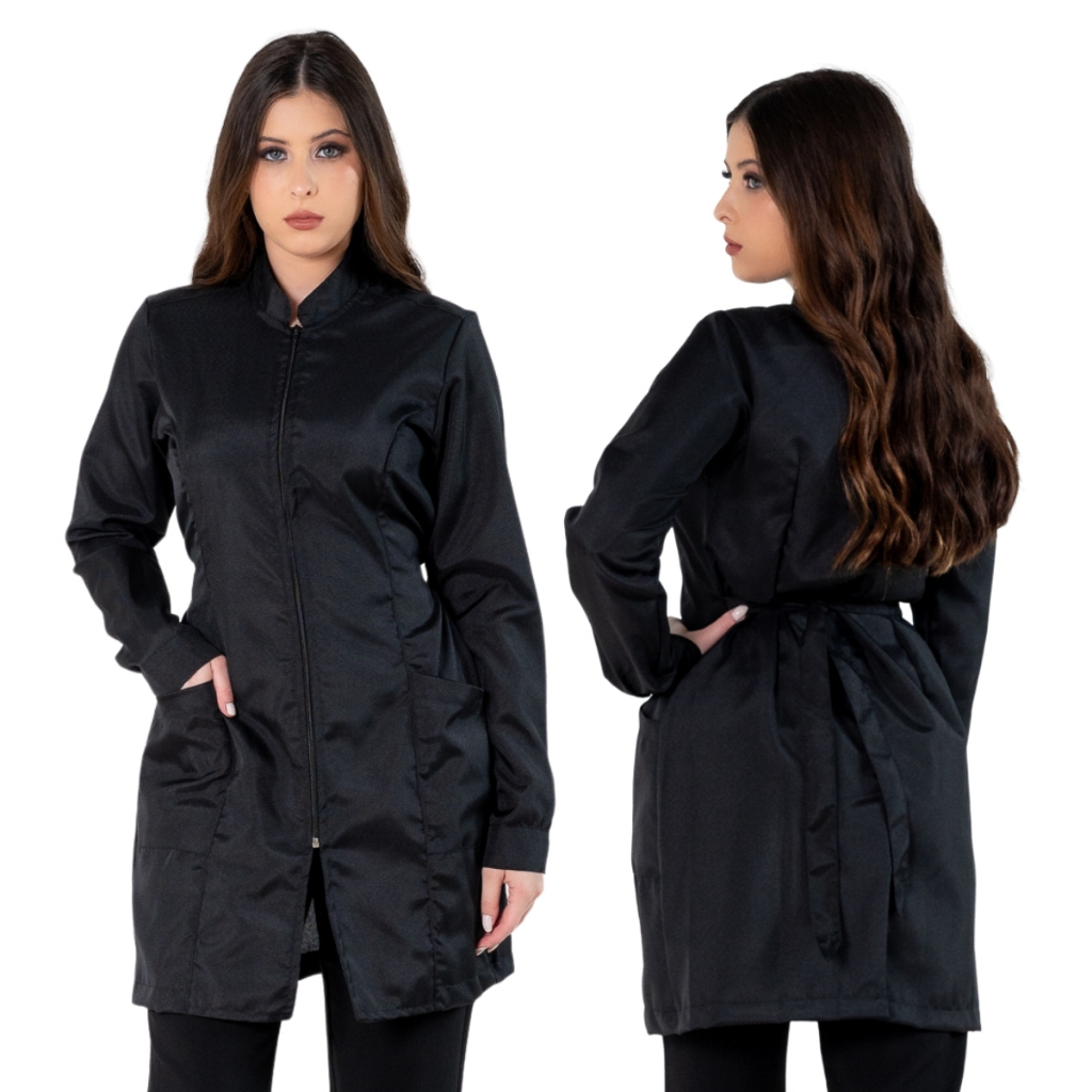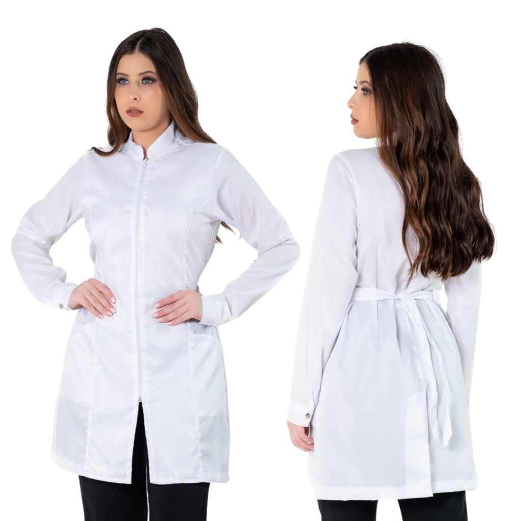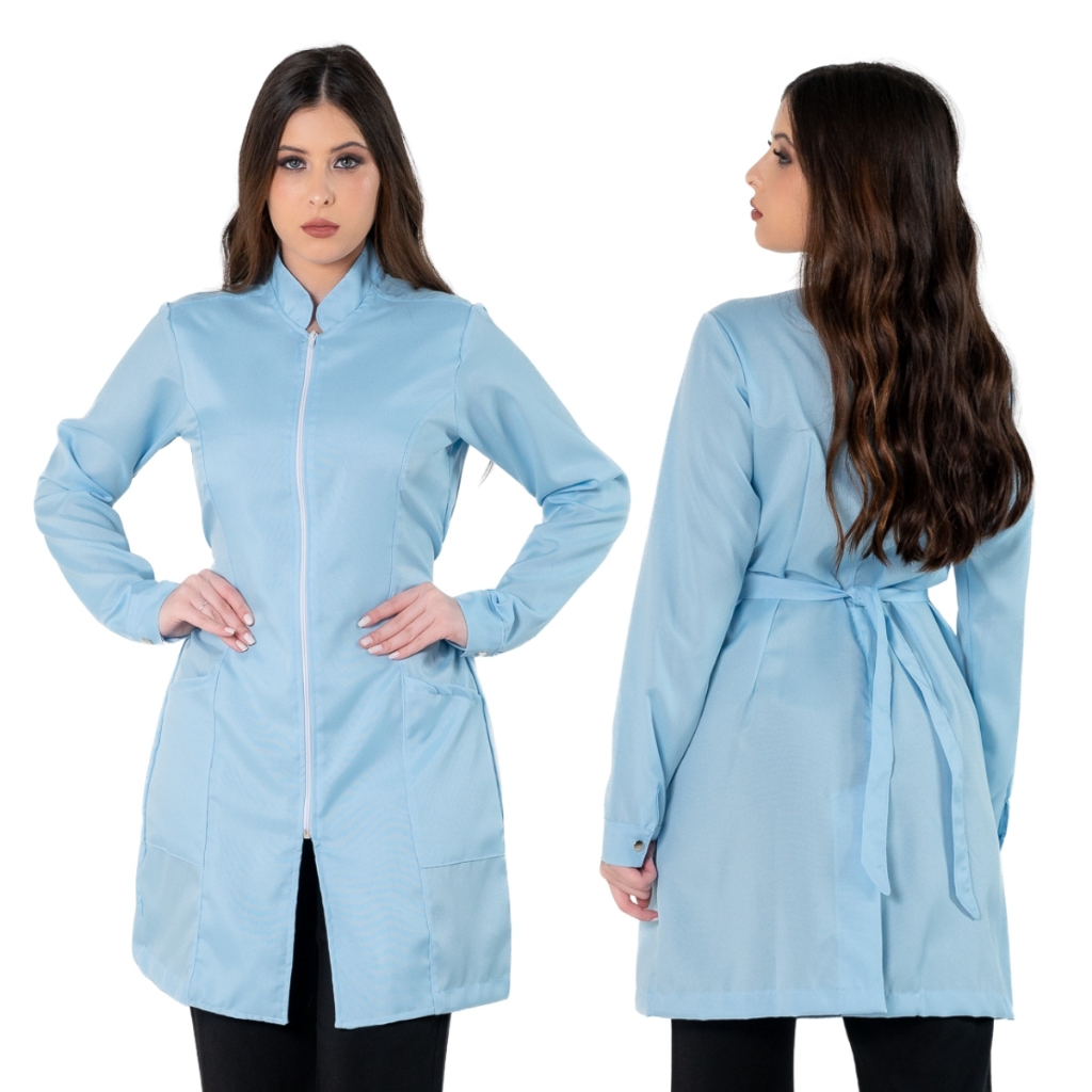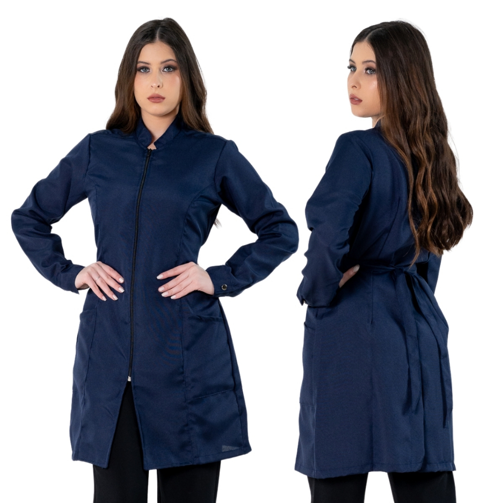 Jaleco Feminino Acinturado Básico Gola Padre Oxford Manga Longa Com Zíper