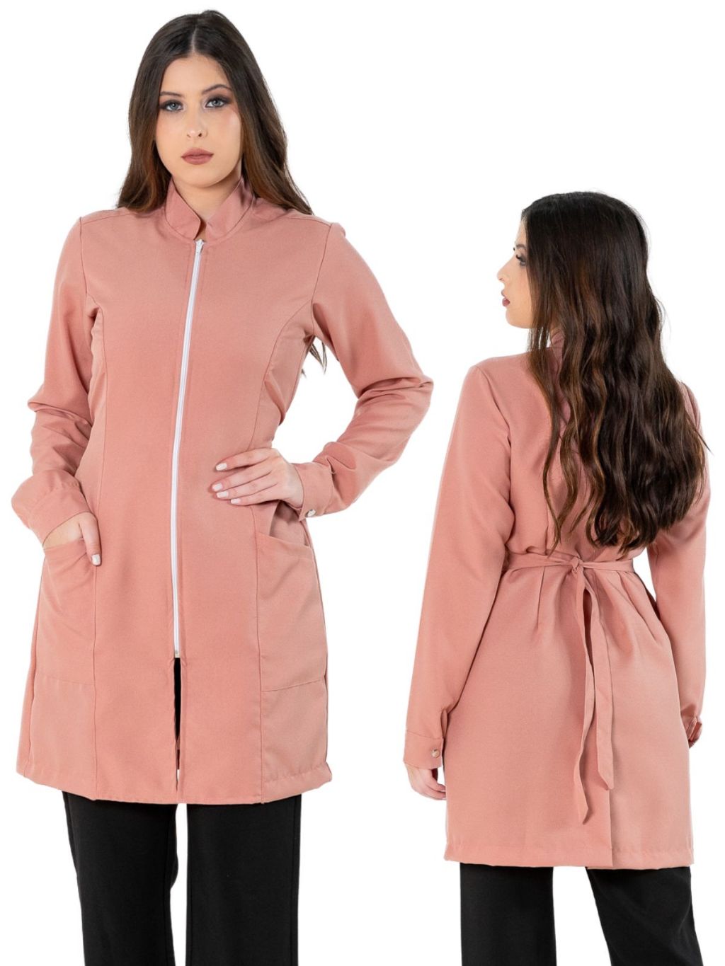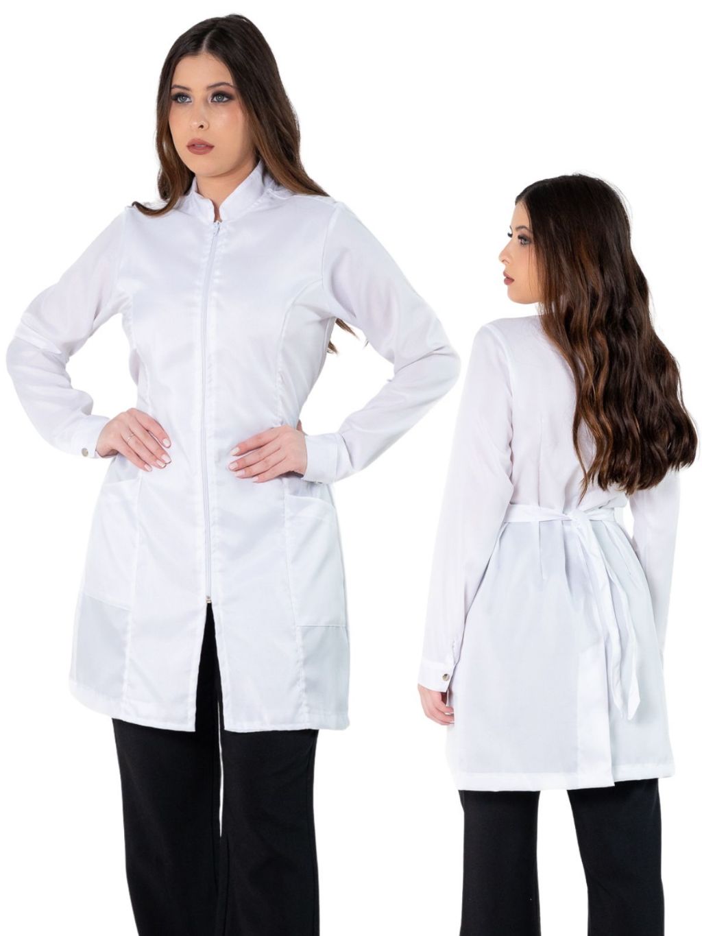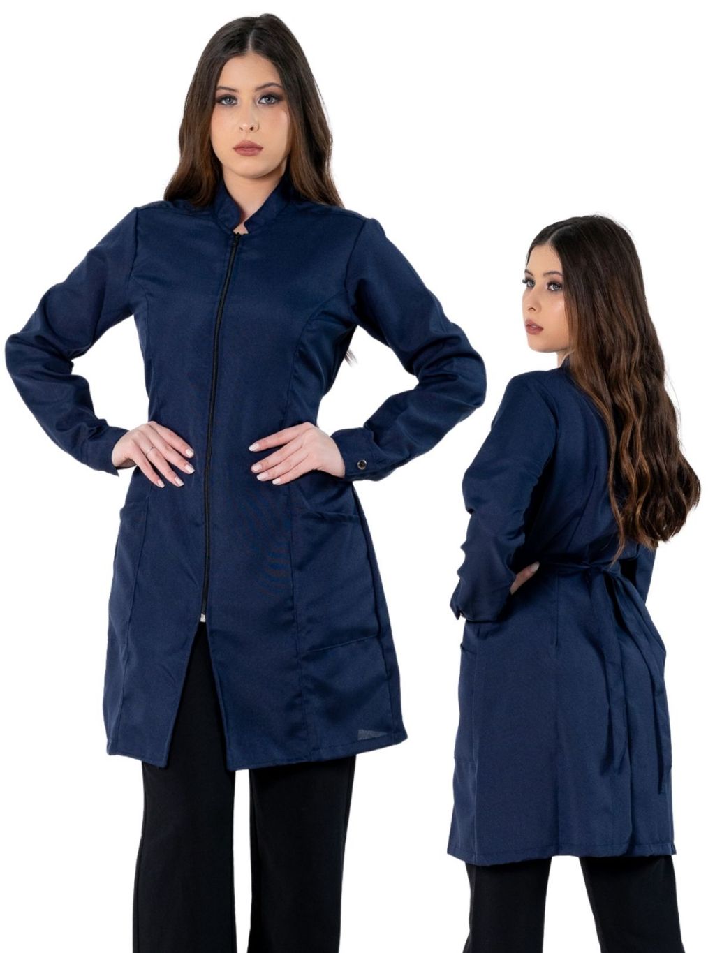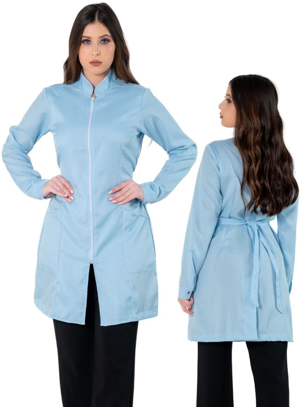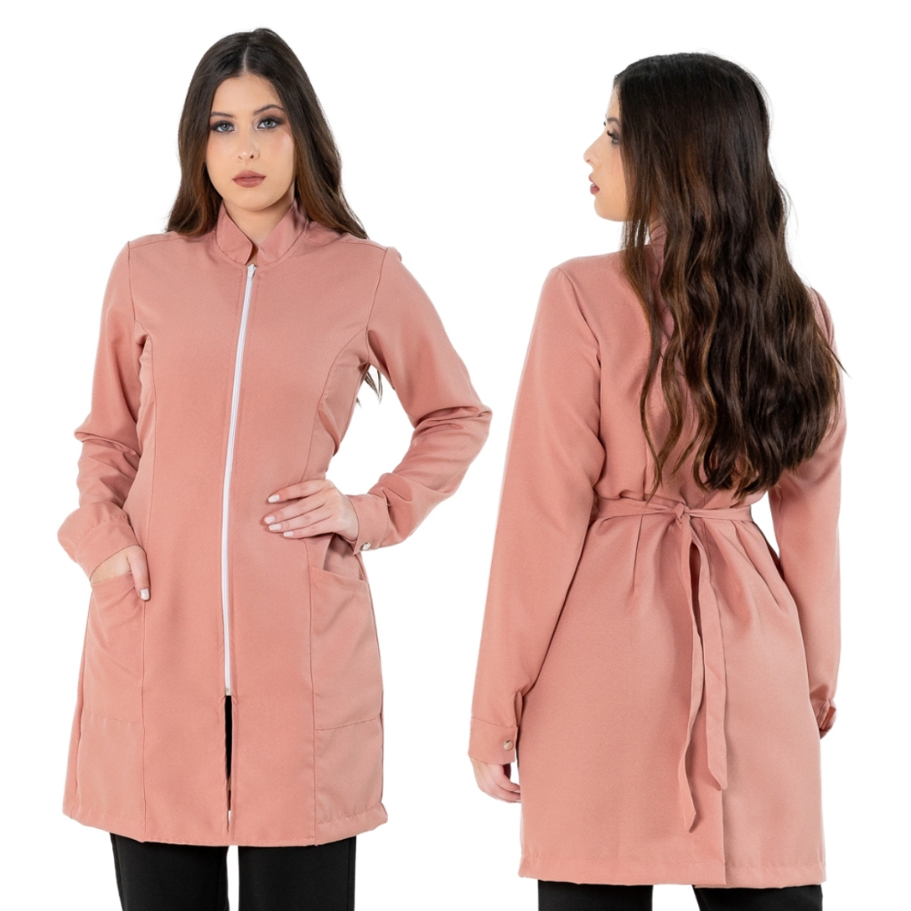 Jaleco Feminino Acinturado Básico Gola Padre Oxford Manga Longa Com Zíper