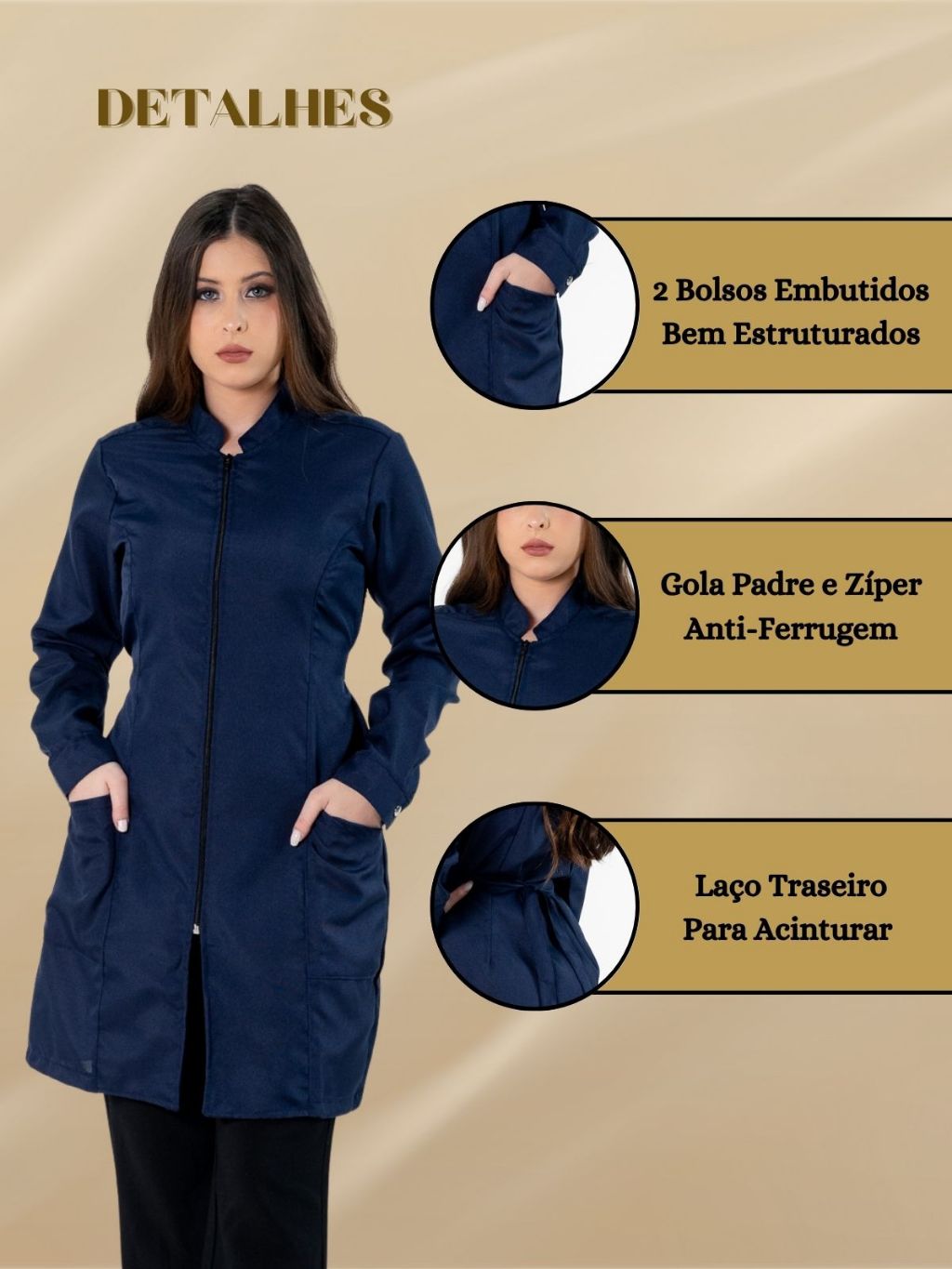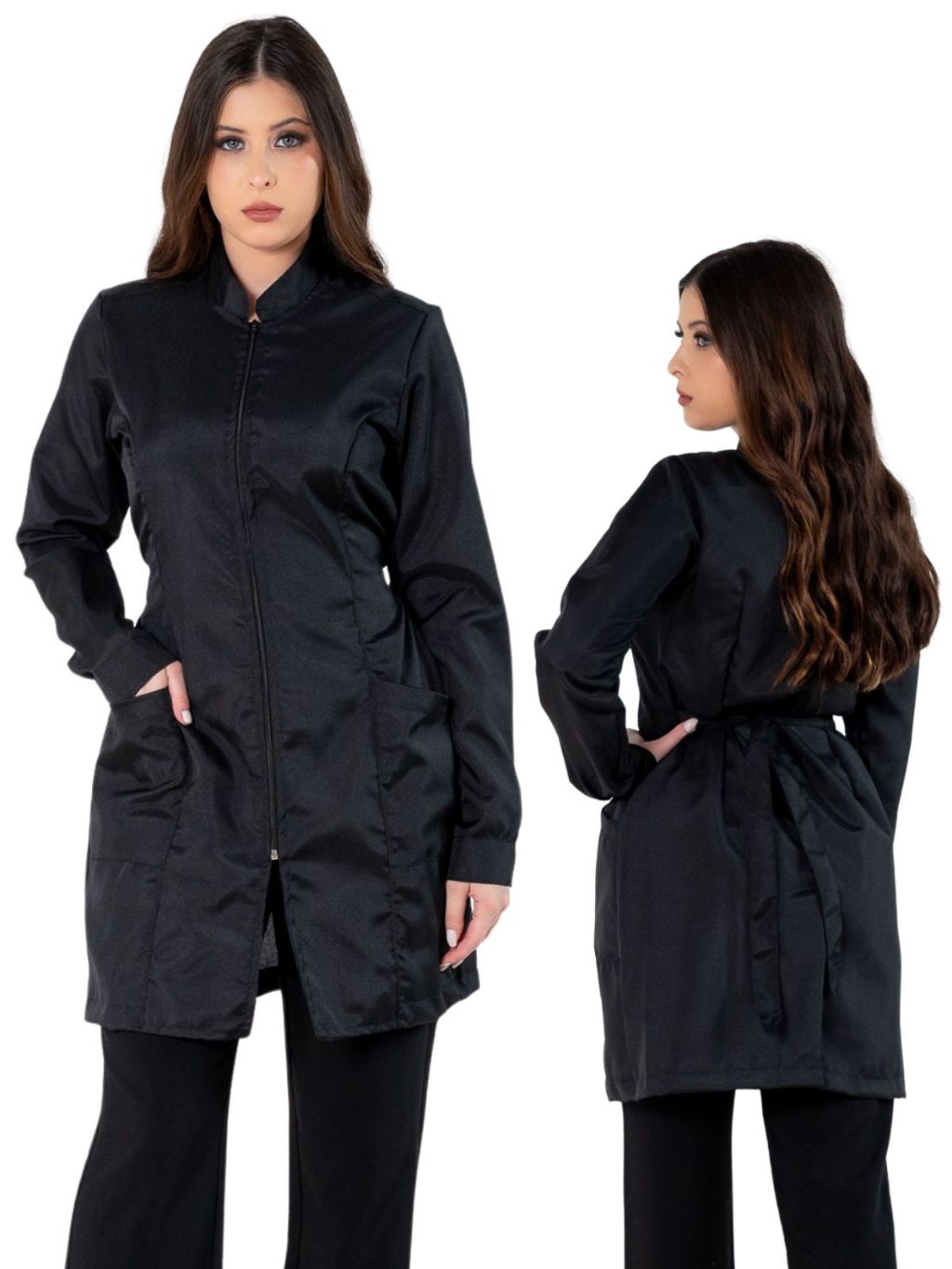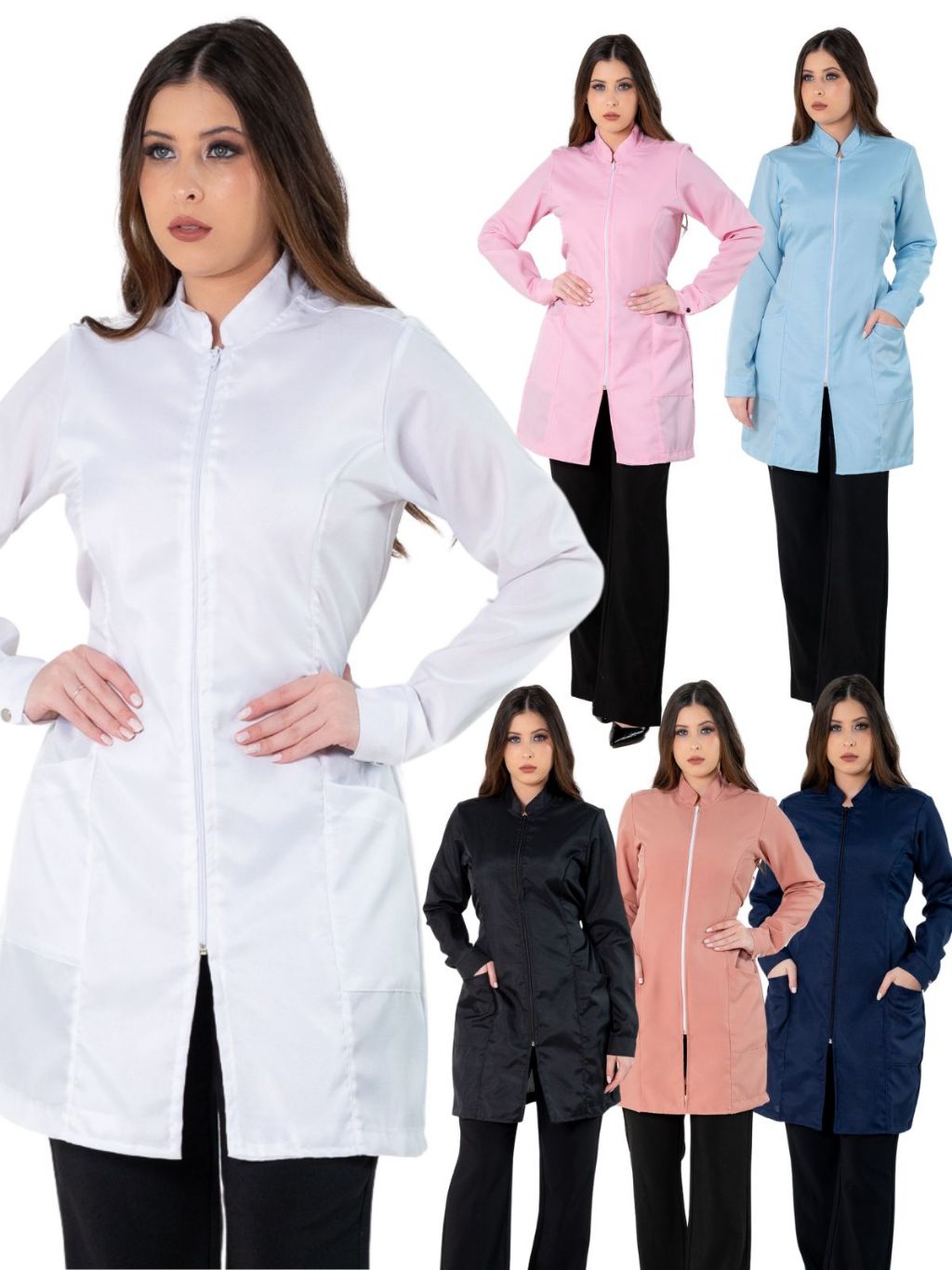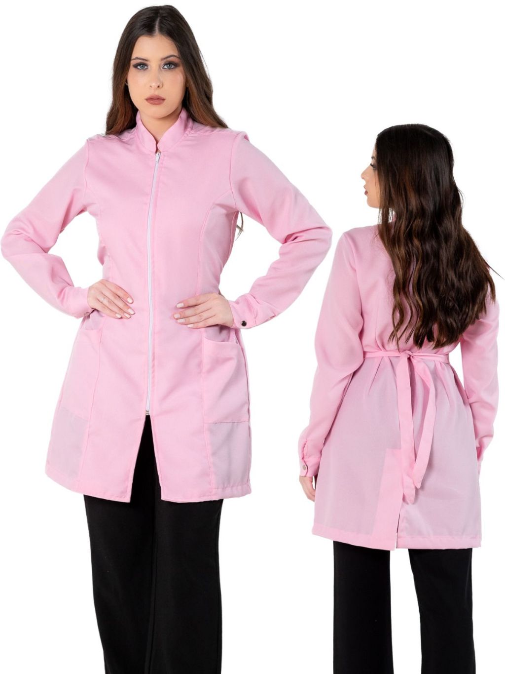 Jaleco Feminino Acinturado Básico Gola Padre Oxford Manga Longa Com Zíper