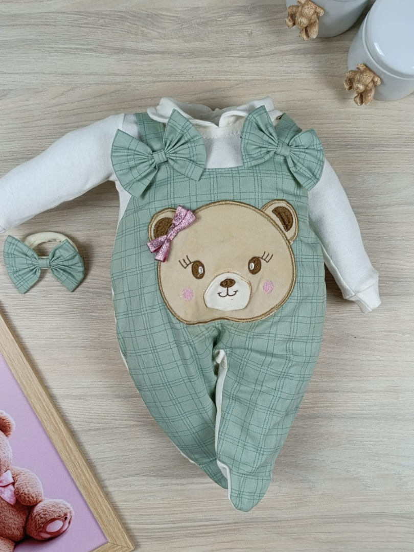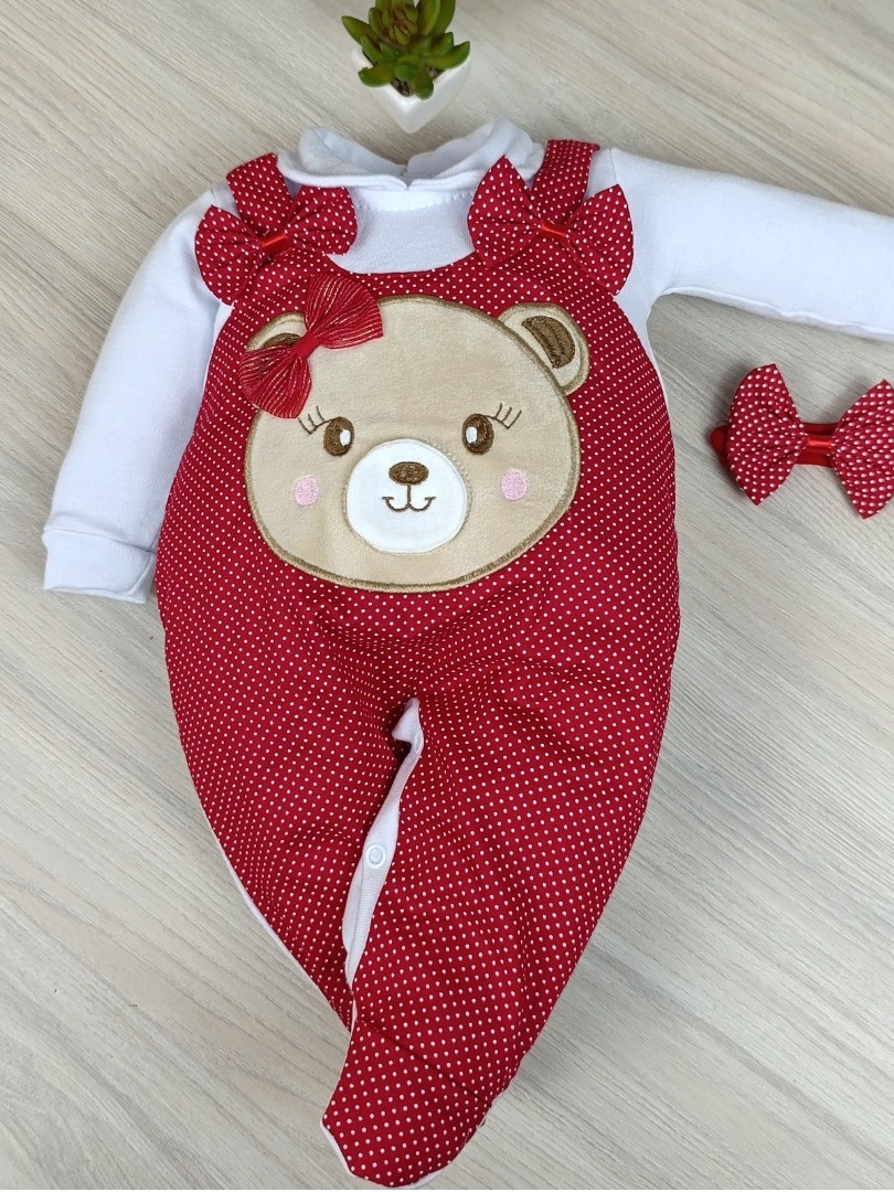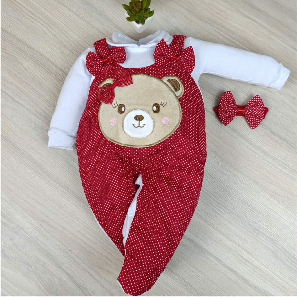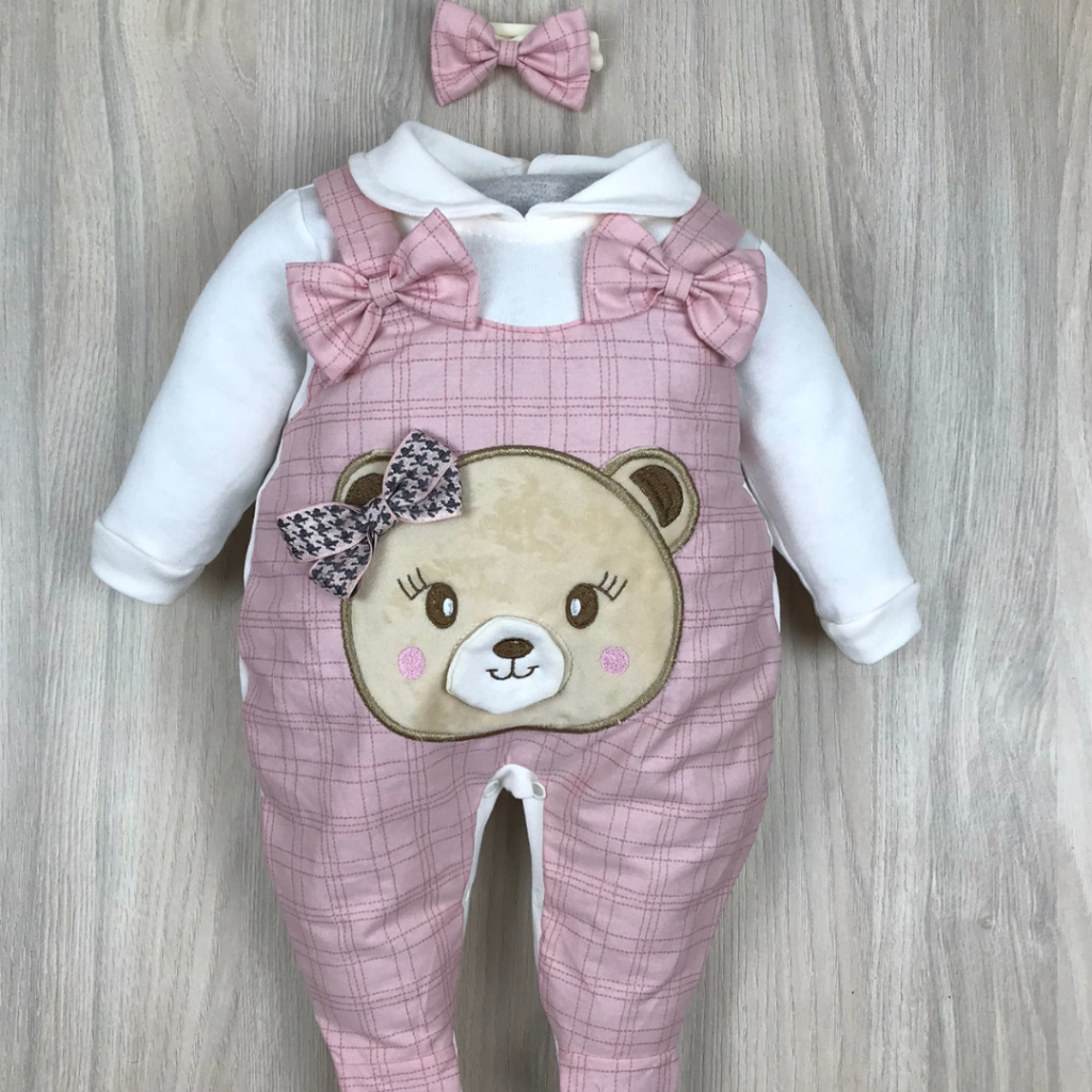 Macacão bebê menina e menino jardineira com laço bordado confortável