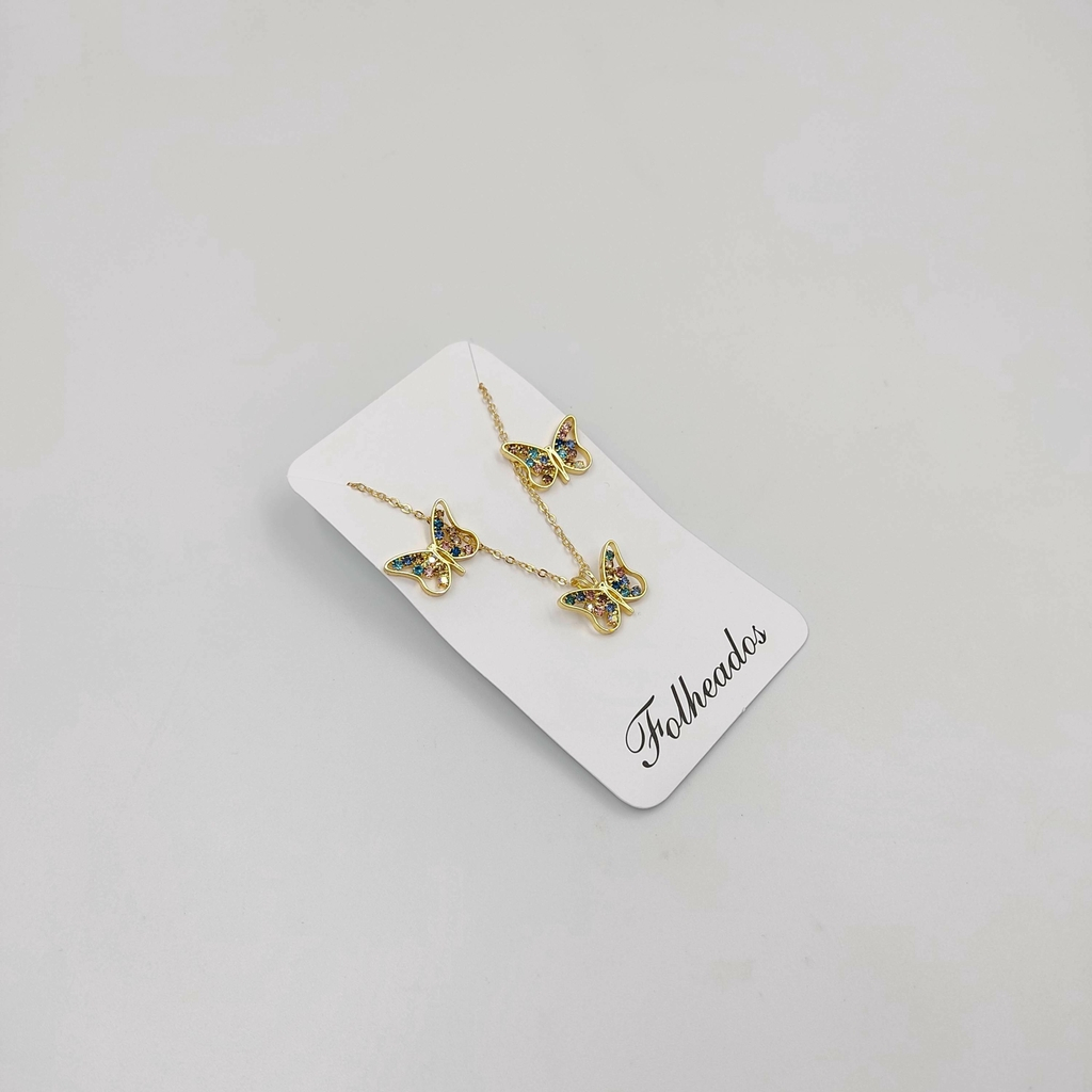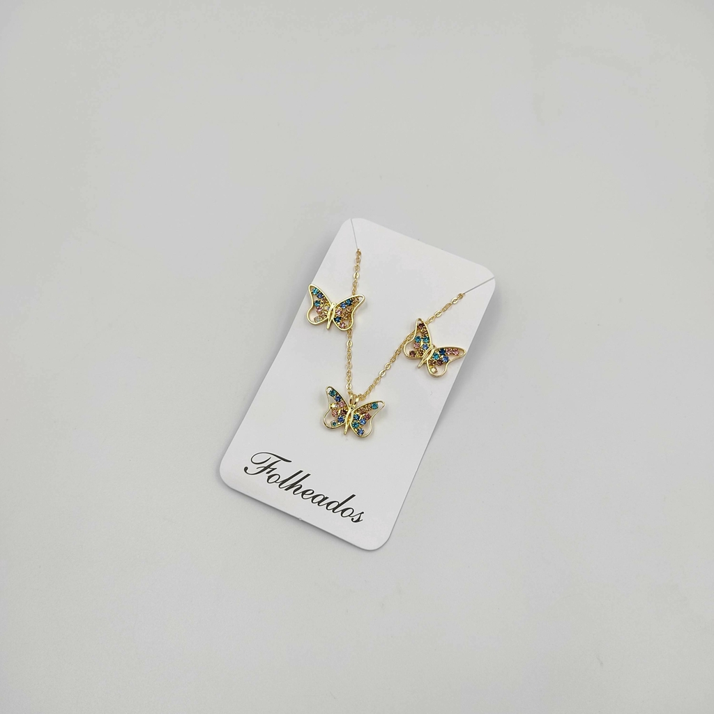 Colar Feminino Conjunto Com Brincos Borboleta Cravejada Colorido Folheados A Ouro Envio Rápido