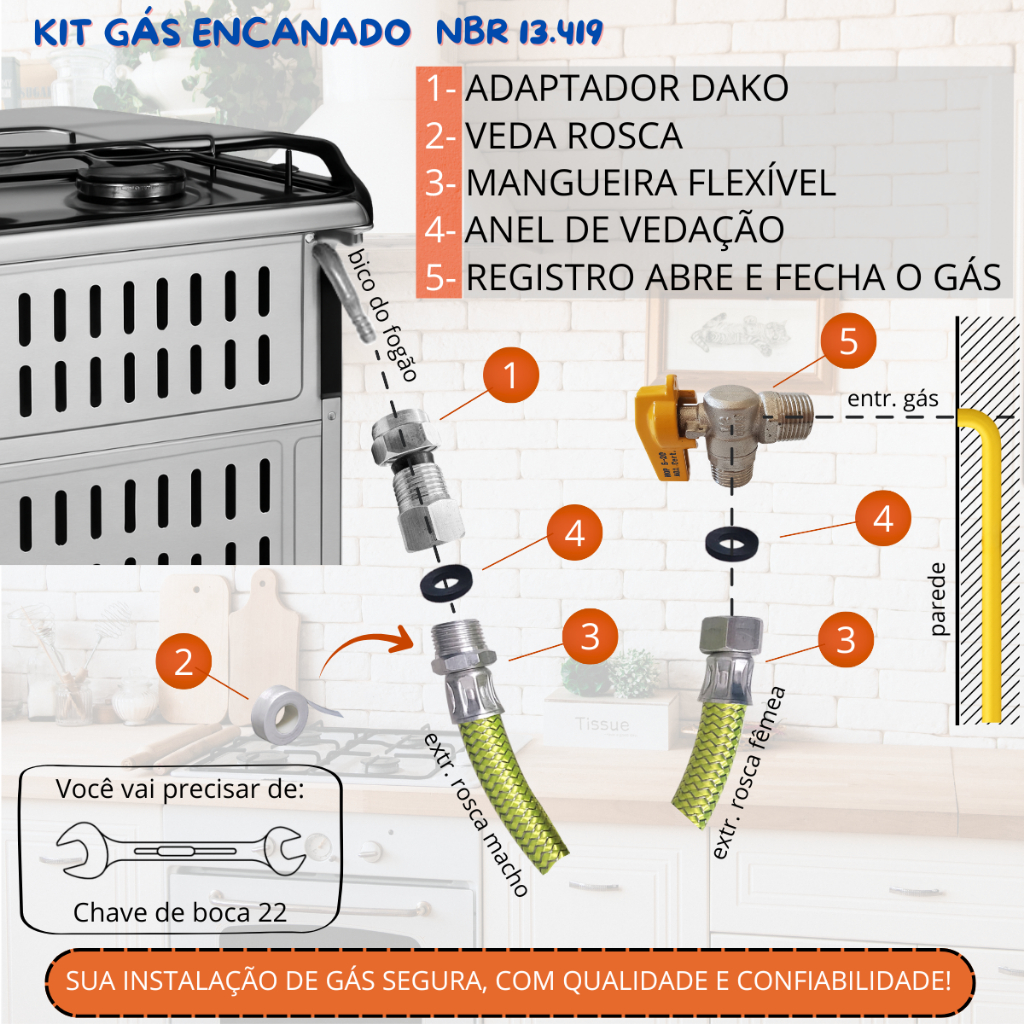 Mangueira Gas Encanado 1,2mt + Adaptador + Registro Fêmea para Cooktop Forno e Fogão