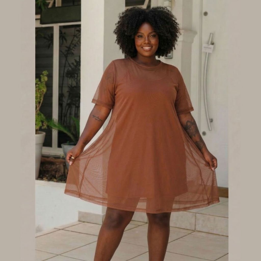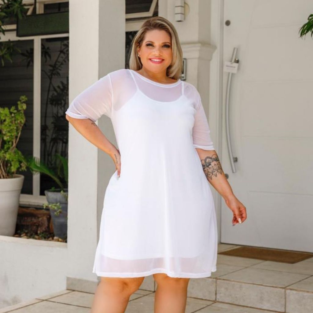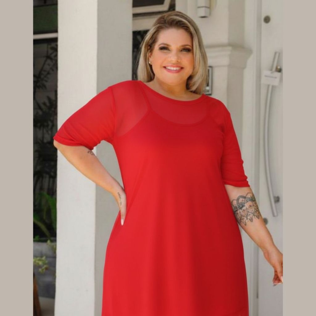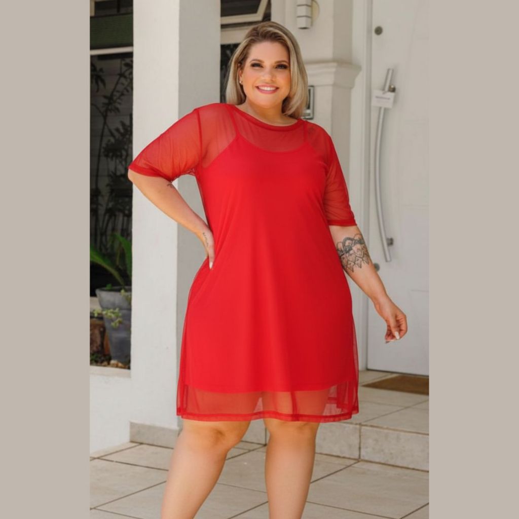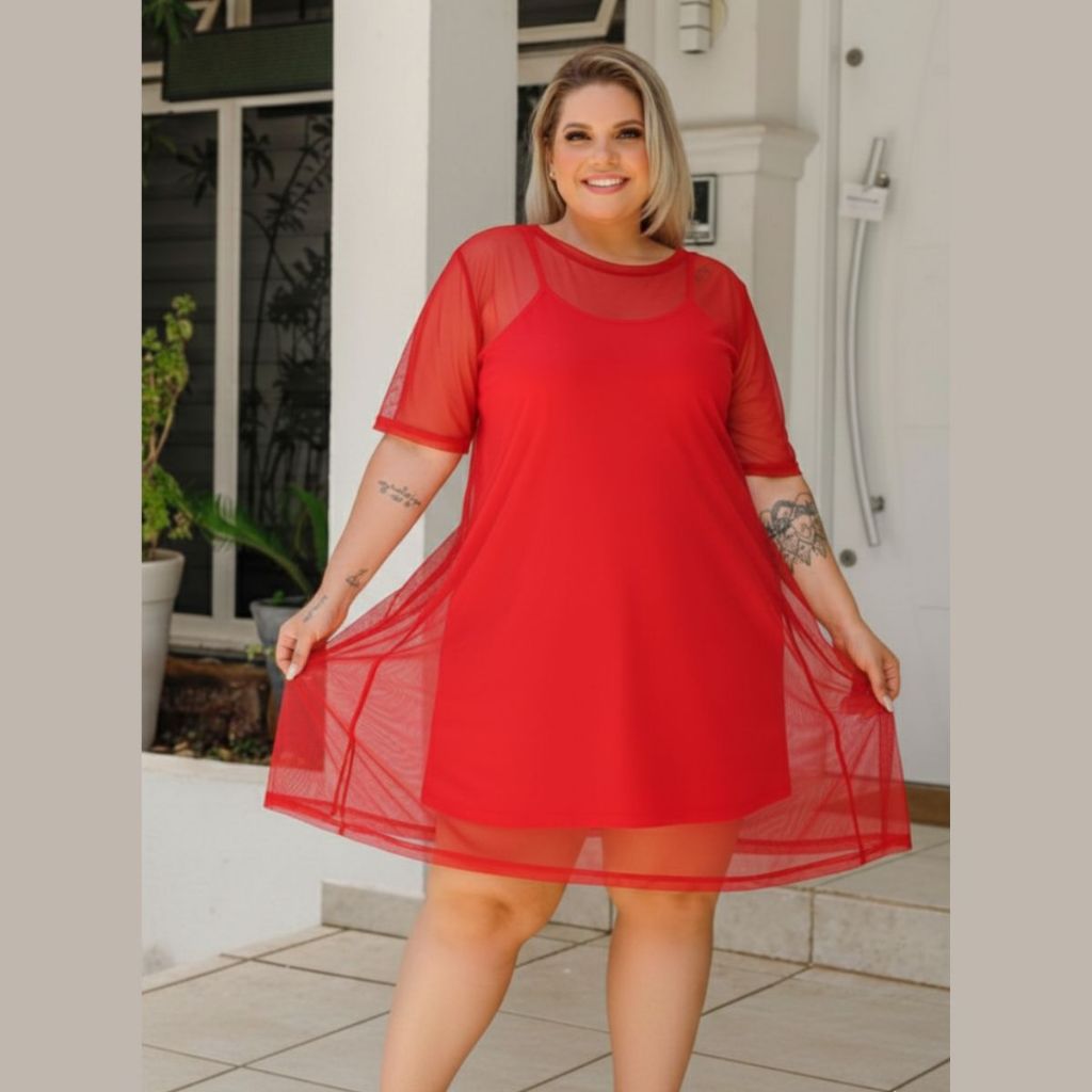Vestido Plus Size Alça Fina em Viscolycra e Tule