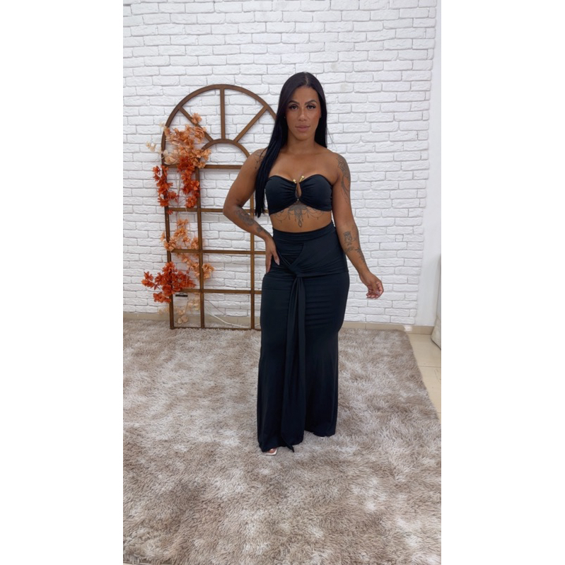 Conjunto Feminino Cropped Tomara Que Caia com Saia Longa Amarração Frontal Moda Gringa fendao