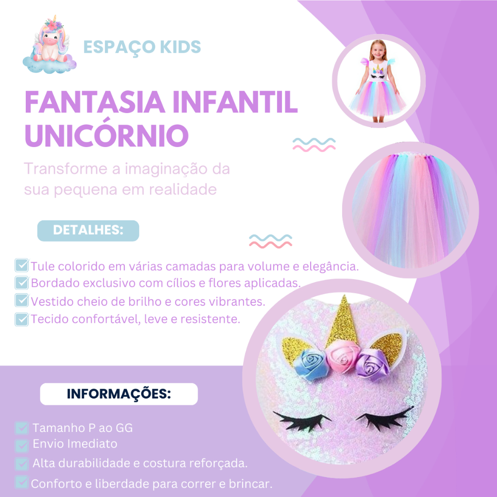 Vestido Fantasia Infantil Princesa Estilo Unicornio Carnaval Festas SEM TIARA