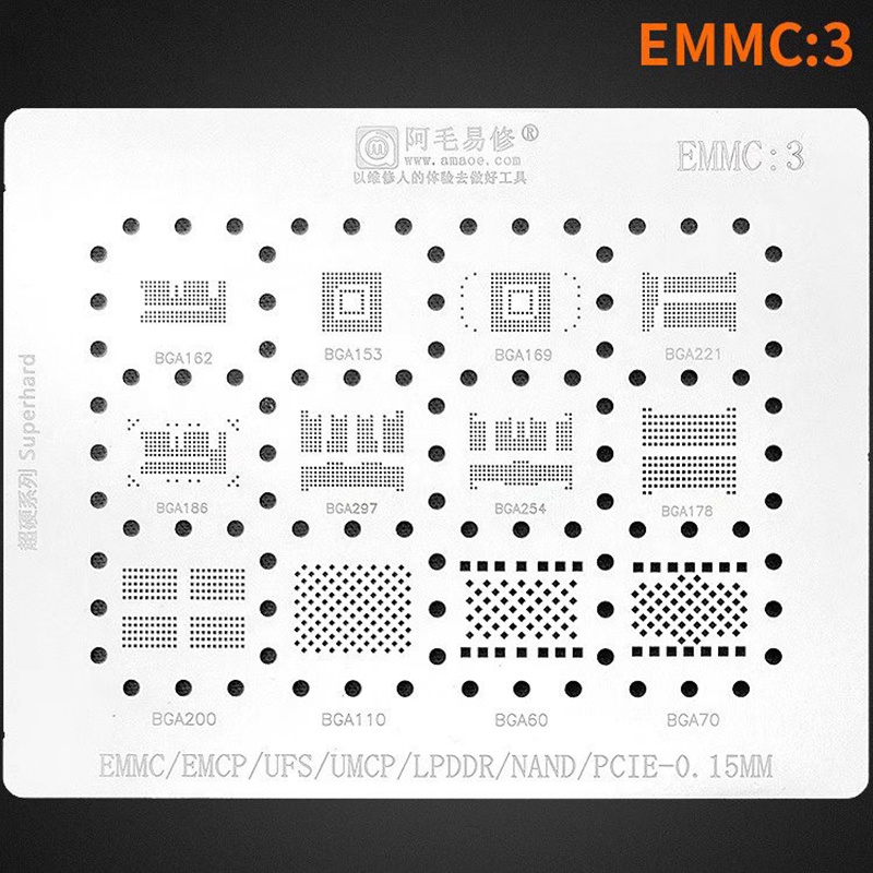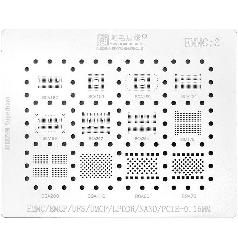 AMAOE EMMC3 BGA Estêncil De Rebolo Para Android Nand Flash EMMC EMCP UFS LPDDR PCIE 153 162 169 200 221 254 60 70 186 20 Rede De Lata
