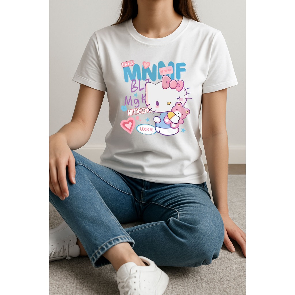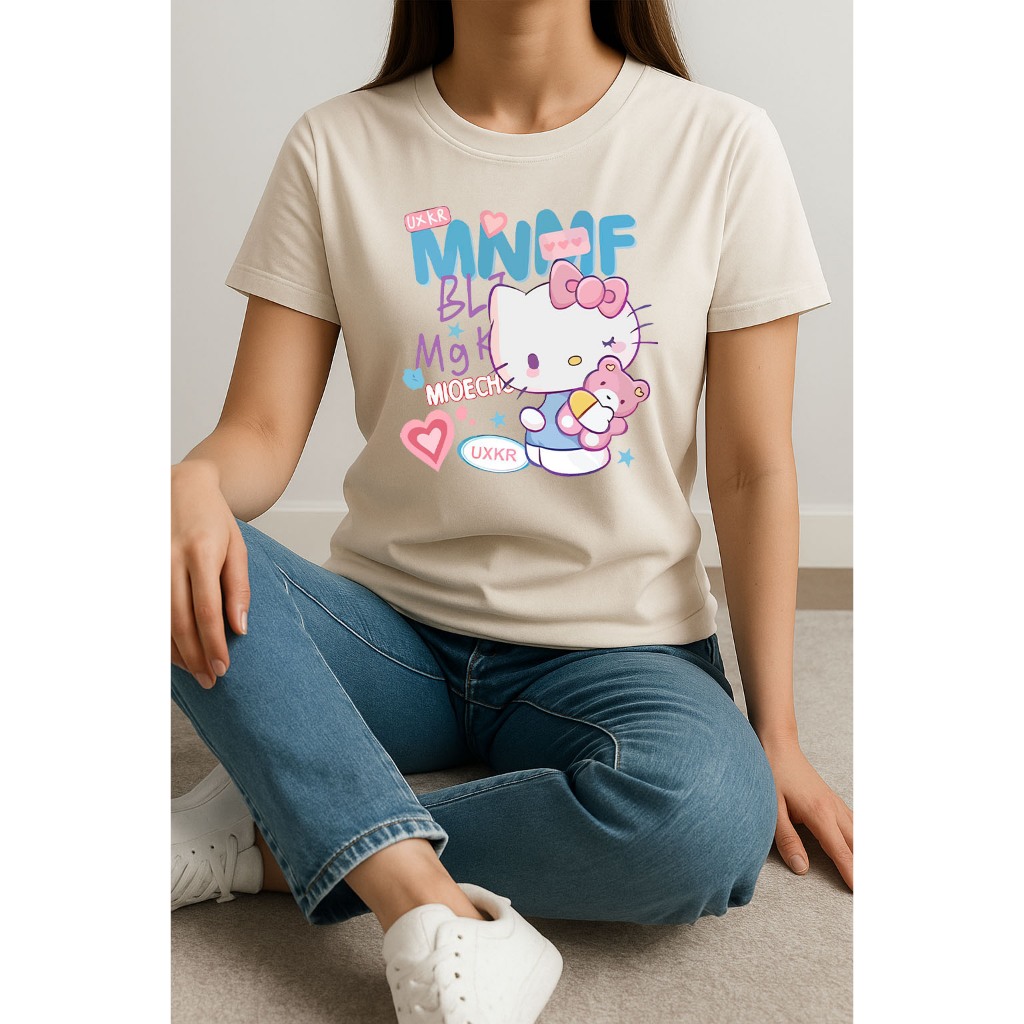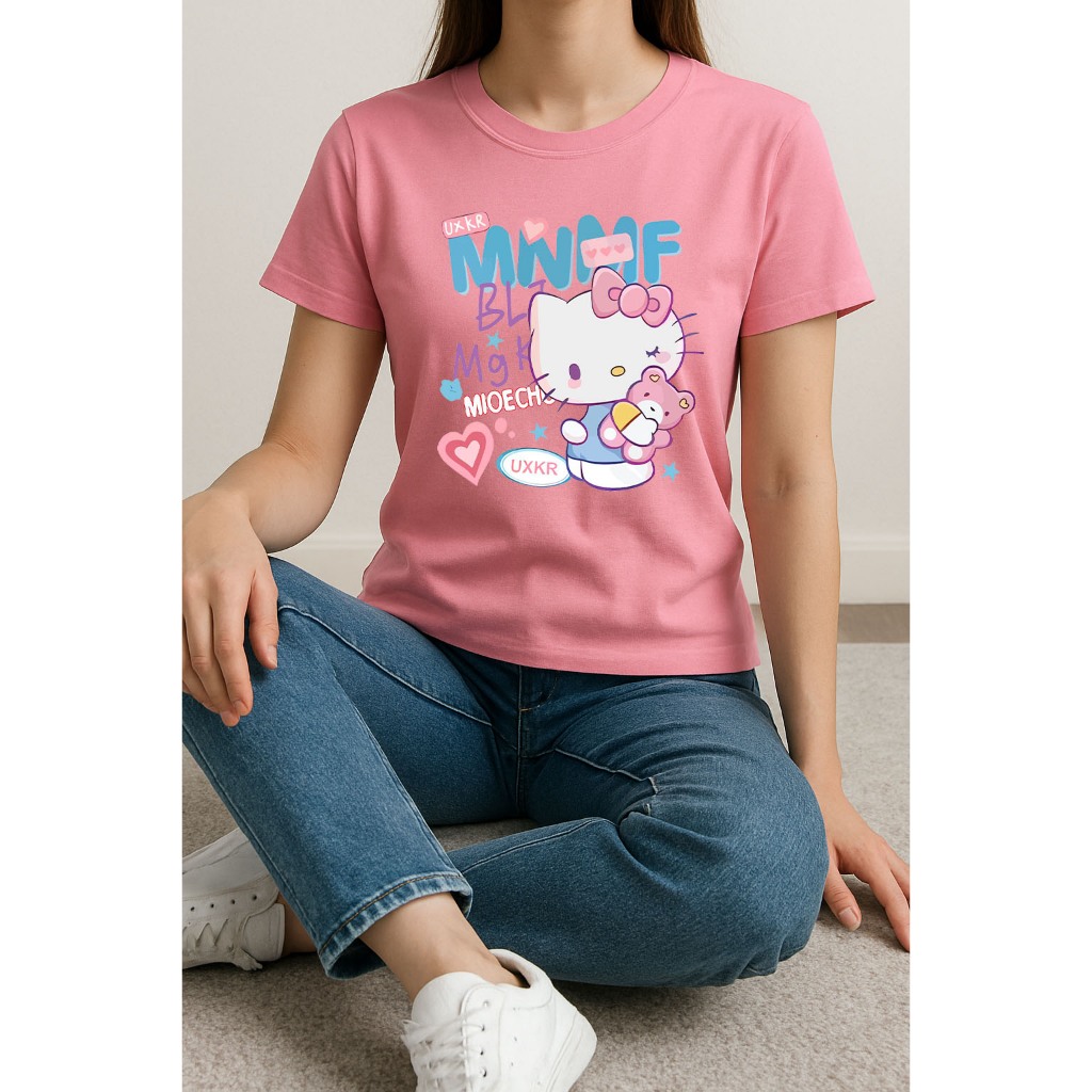 Camiseta Feminina Hello Kitty e Ursinho Rosa manga curta em algodão