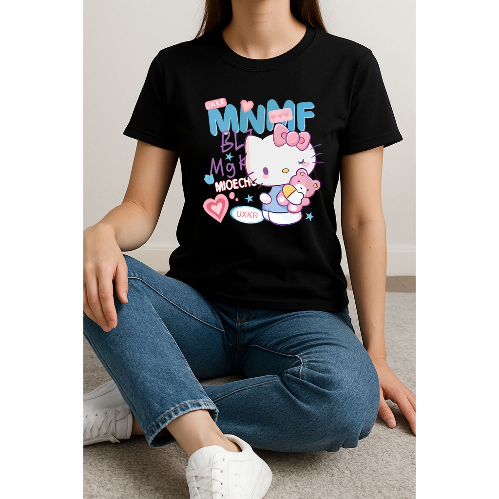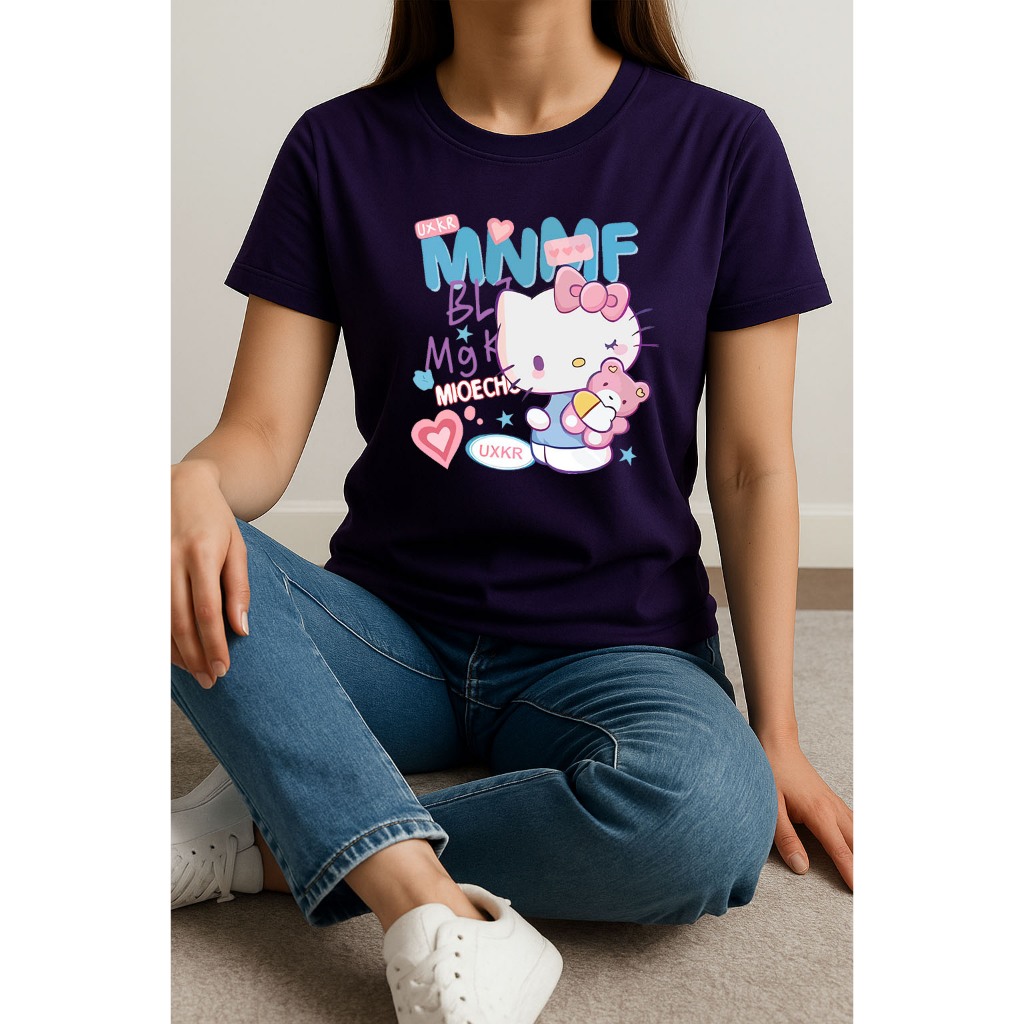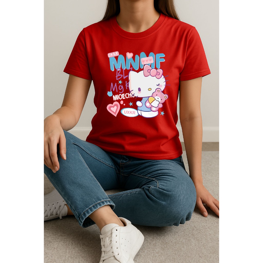Camiseta Feminina Hello Kitty e Ursinho Rosa manga curta em algodão