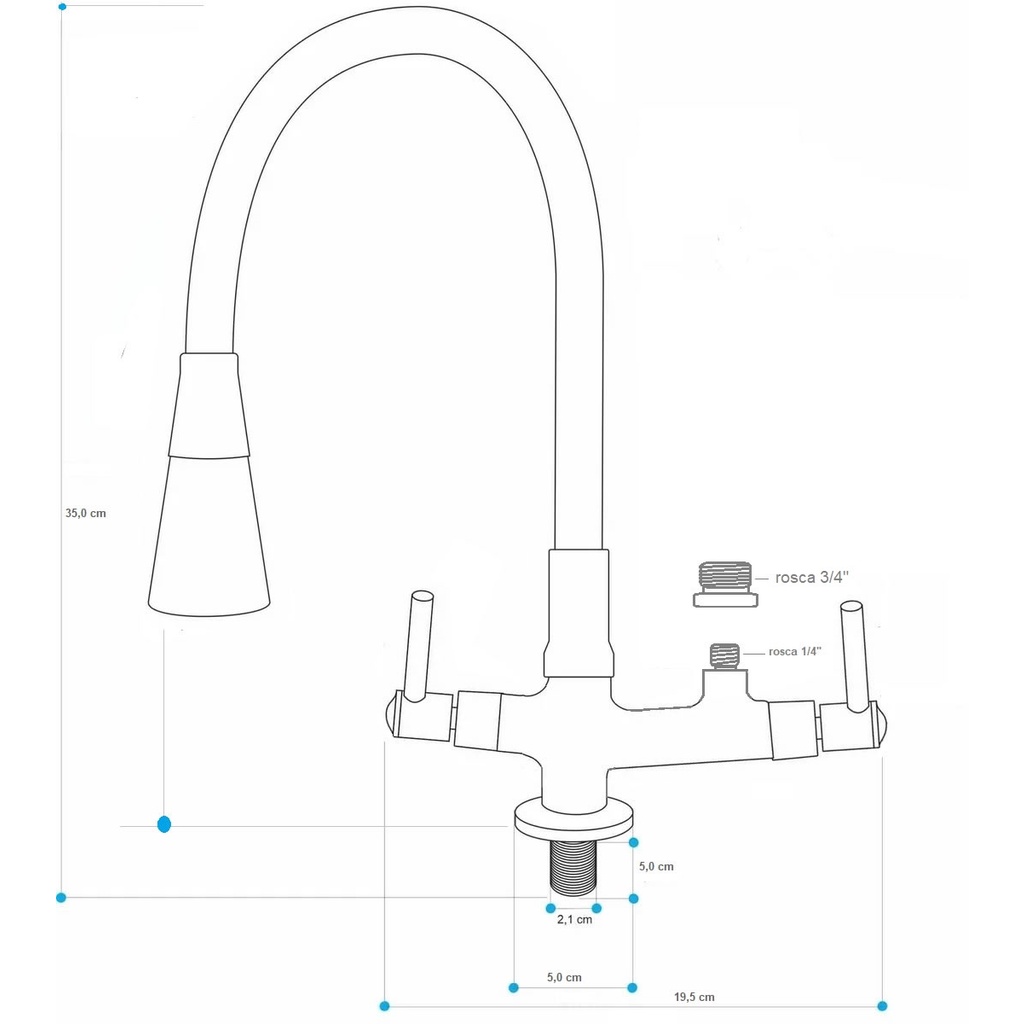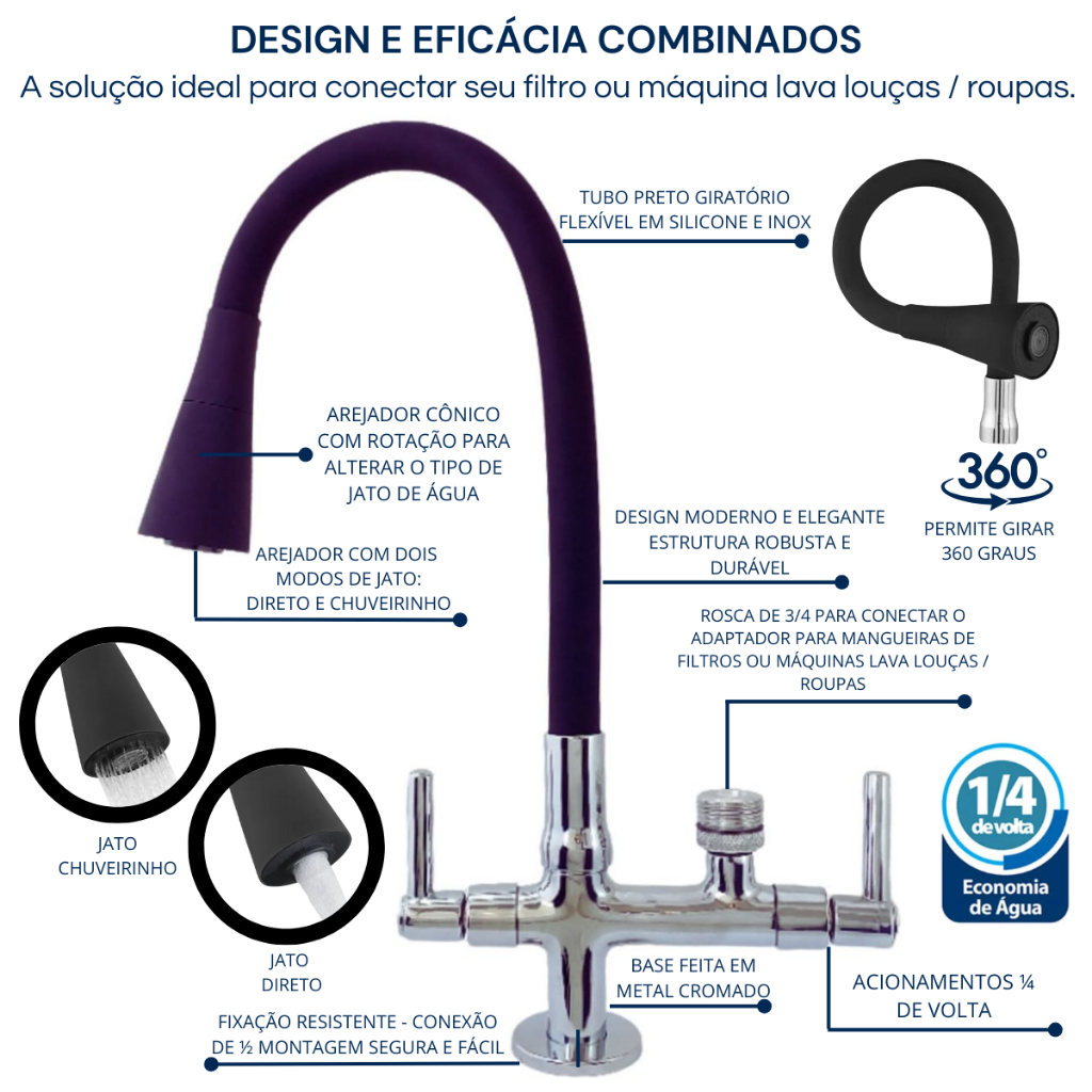Torneira Bancada c/ Tubo Gourmet Preto Cone Silicone p/ Filtro 1/4" ou Máquina Lavar LOUÇA 3/4" 2143