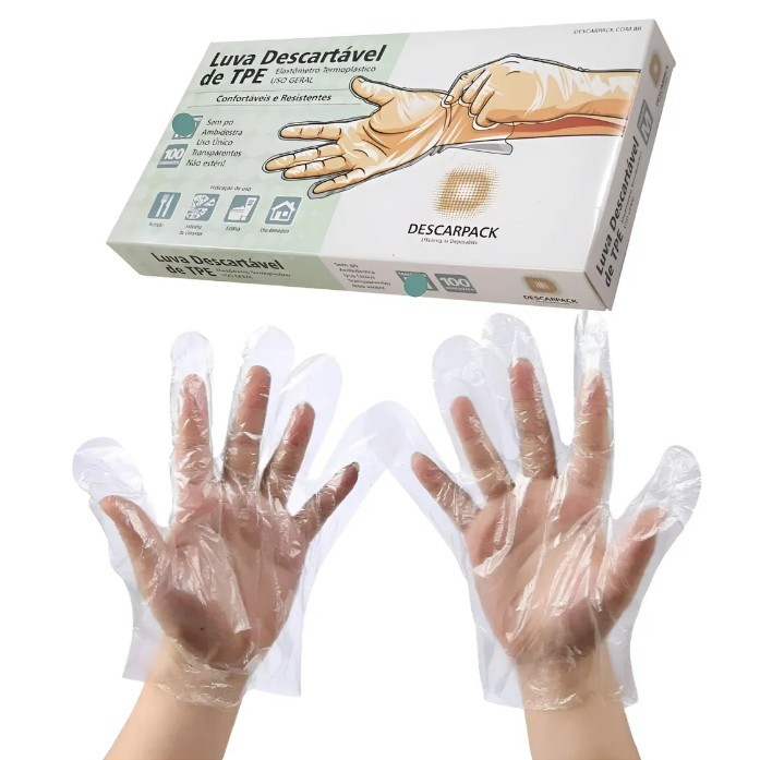 Kit C/10 Caixas (1.000) Luvas Plástica TPE Transparente S/Pó Tamanho: M - Descarpack