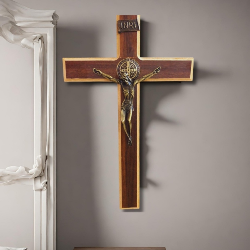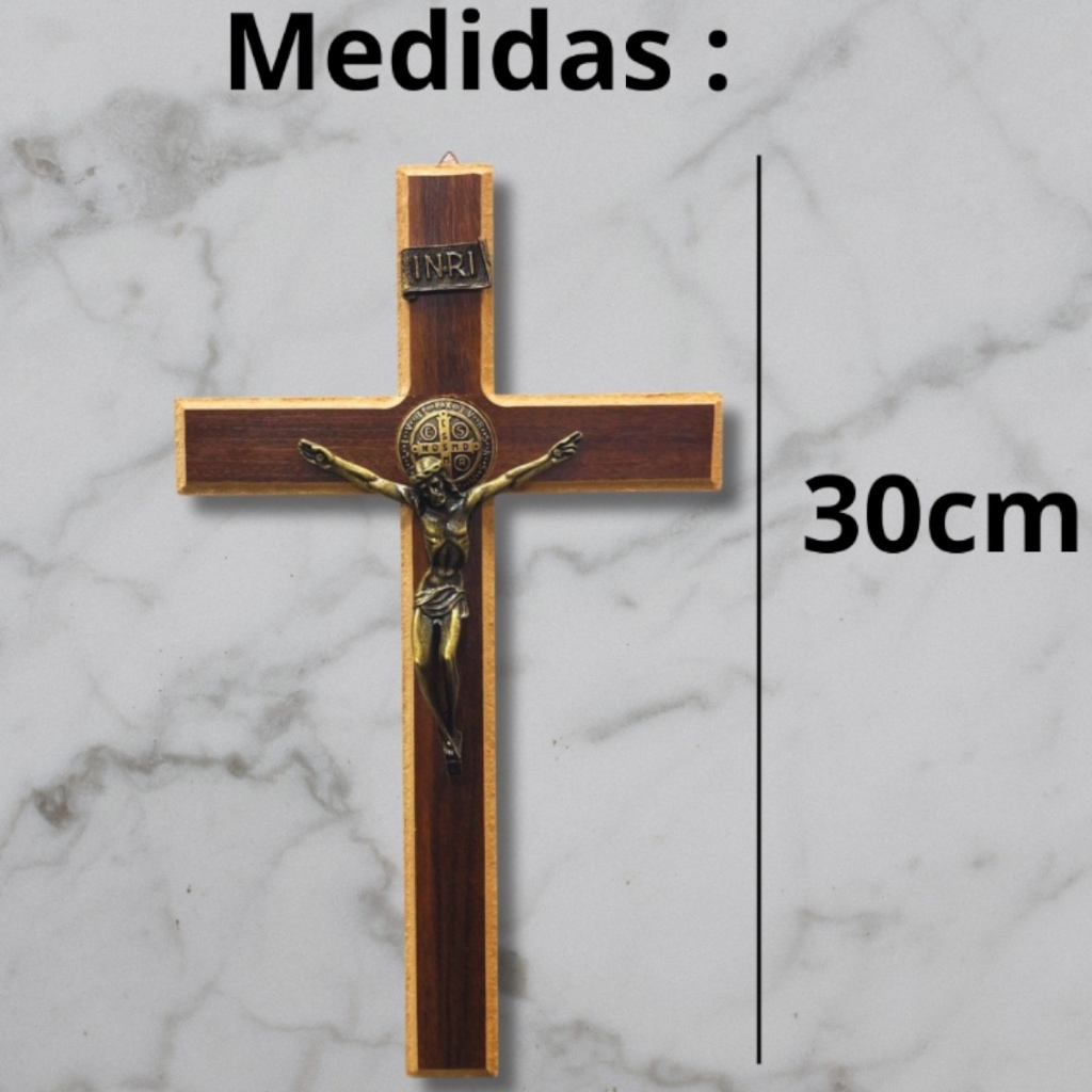 Crucifixo De Madeira Grande E Metal Medalha São Bento 30cm Lindo