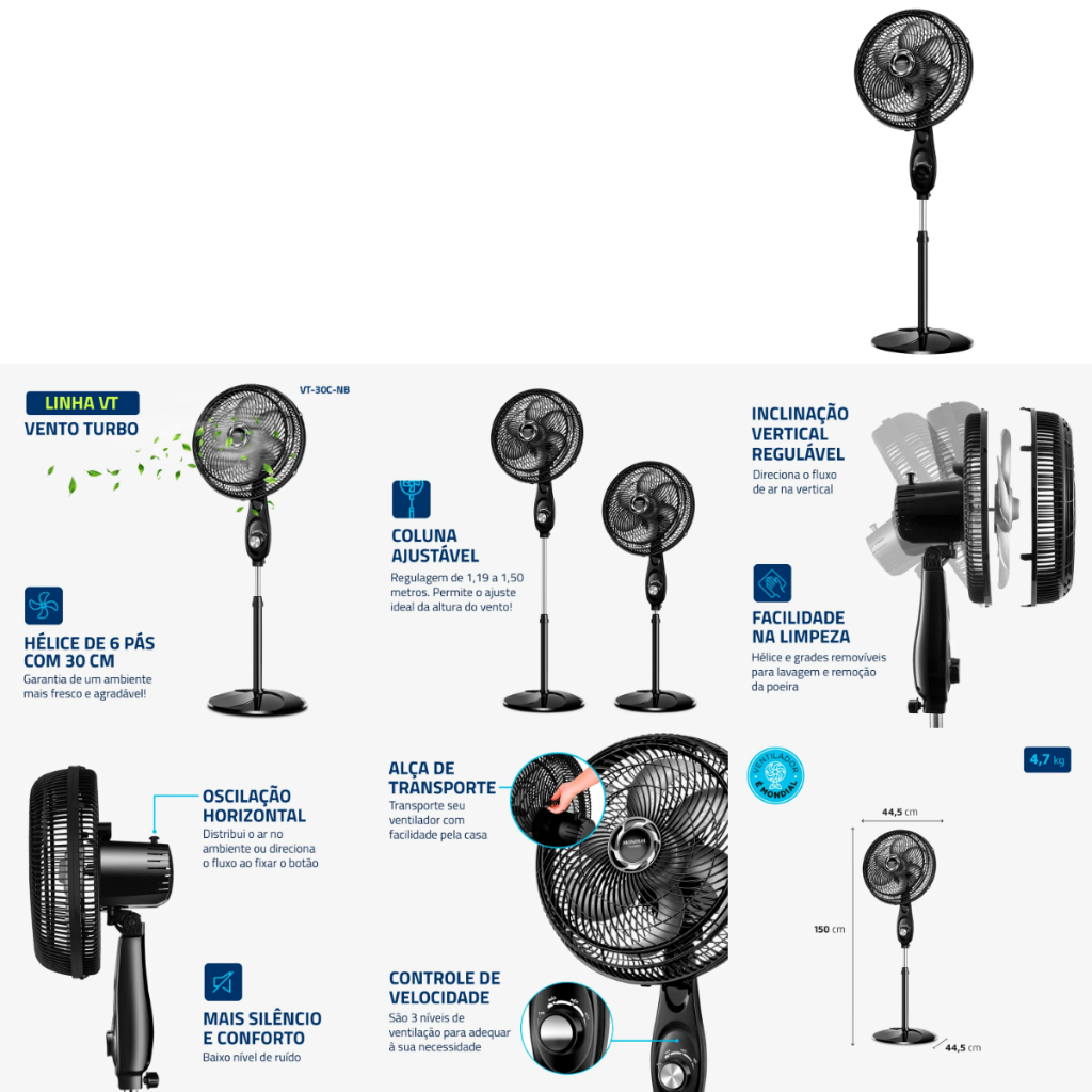 Ventilador de Coluna VT 30C 220v 30cm Turbo Mondial Preto 60W 6 Pás