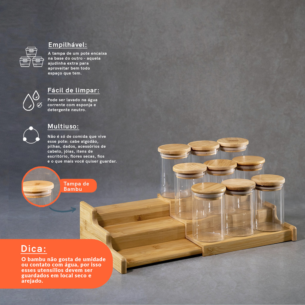 Kit 9 Potes 250ml Tampa Bambu E Rack Organizador Bambu Oikos
