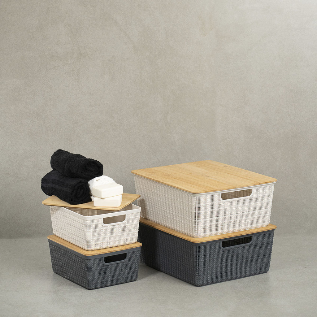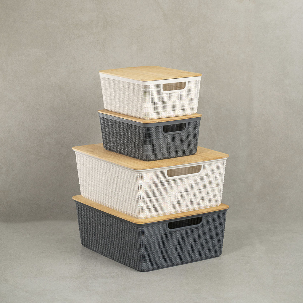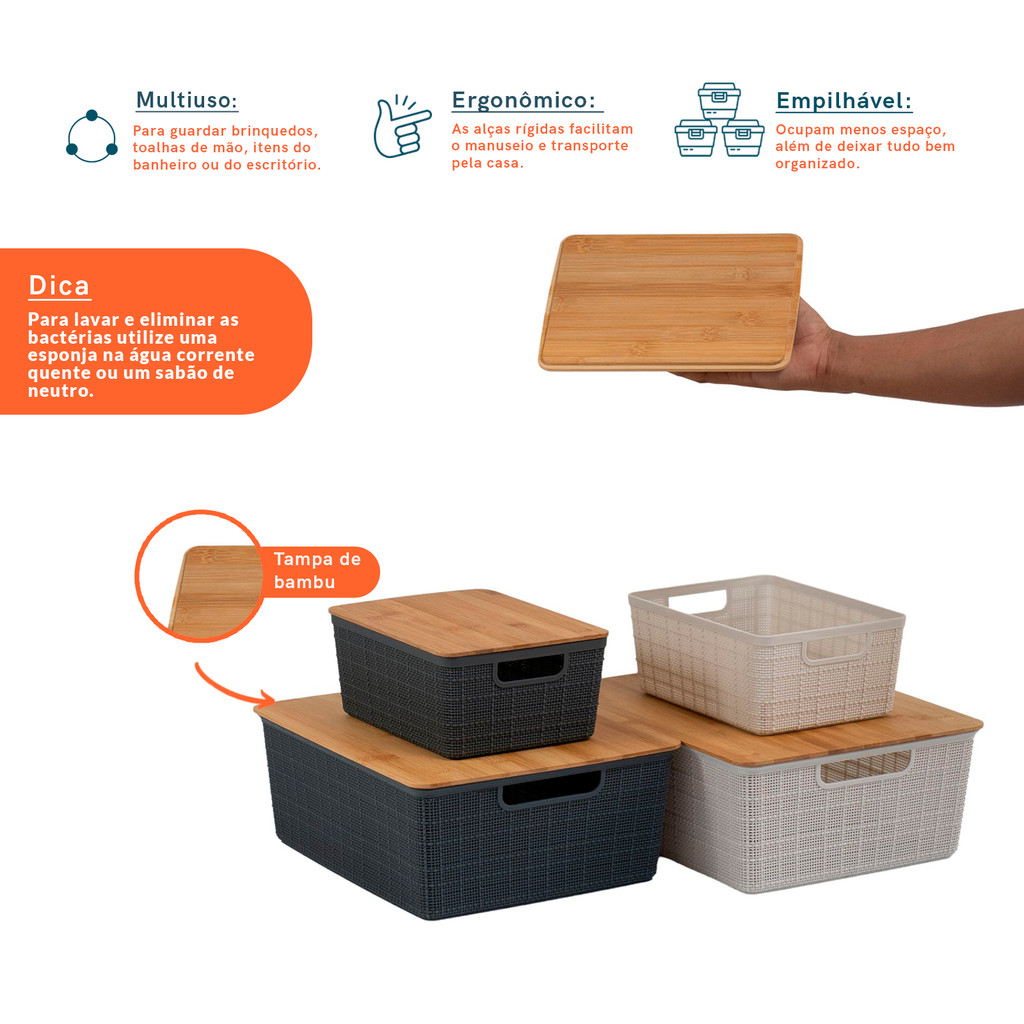 Kit 4 Caixas Organizadoras Tampa Bambu 2p/2m Branco/Cinza Oikos