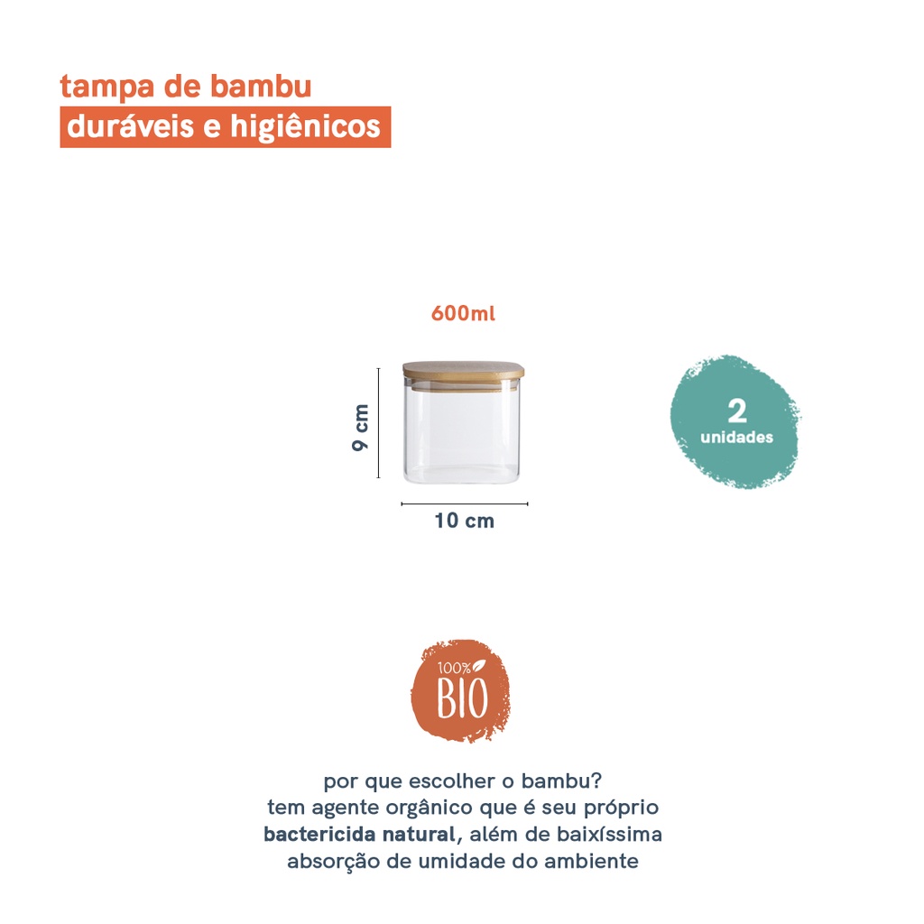 kit 2 potes de vidro quadrados 600ml com tampa de bambu - oikos