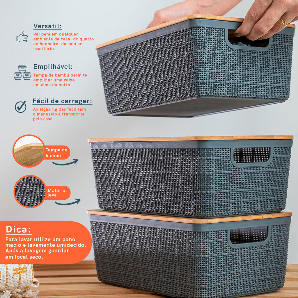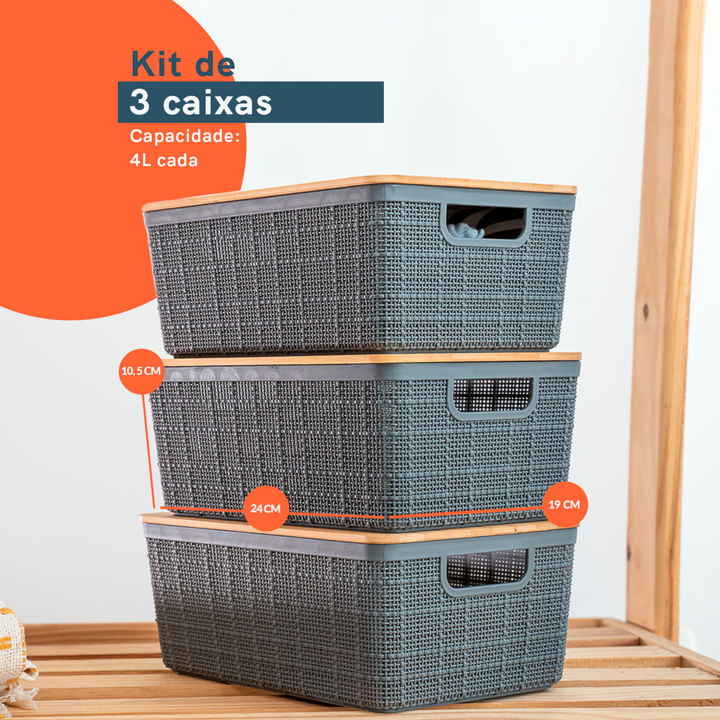 Kit 3 Caixas Organizadoras 4 Litros Cinza C/ Tampa Bambu Oikos