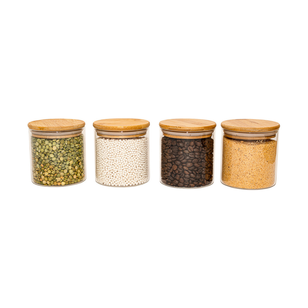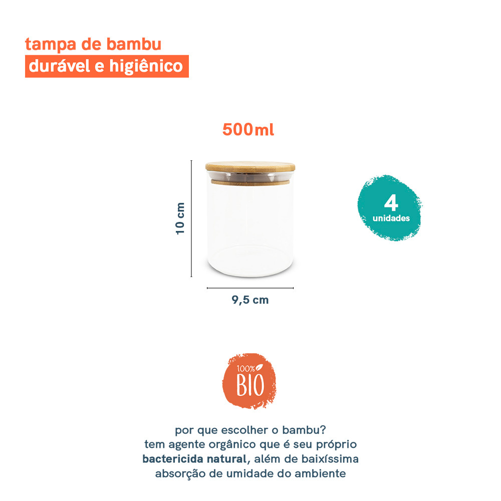 Potes de Vidro P/ Mantimentos 500ml C/ Tampa Bambu - 4 Pçs Oikos