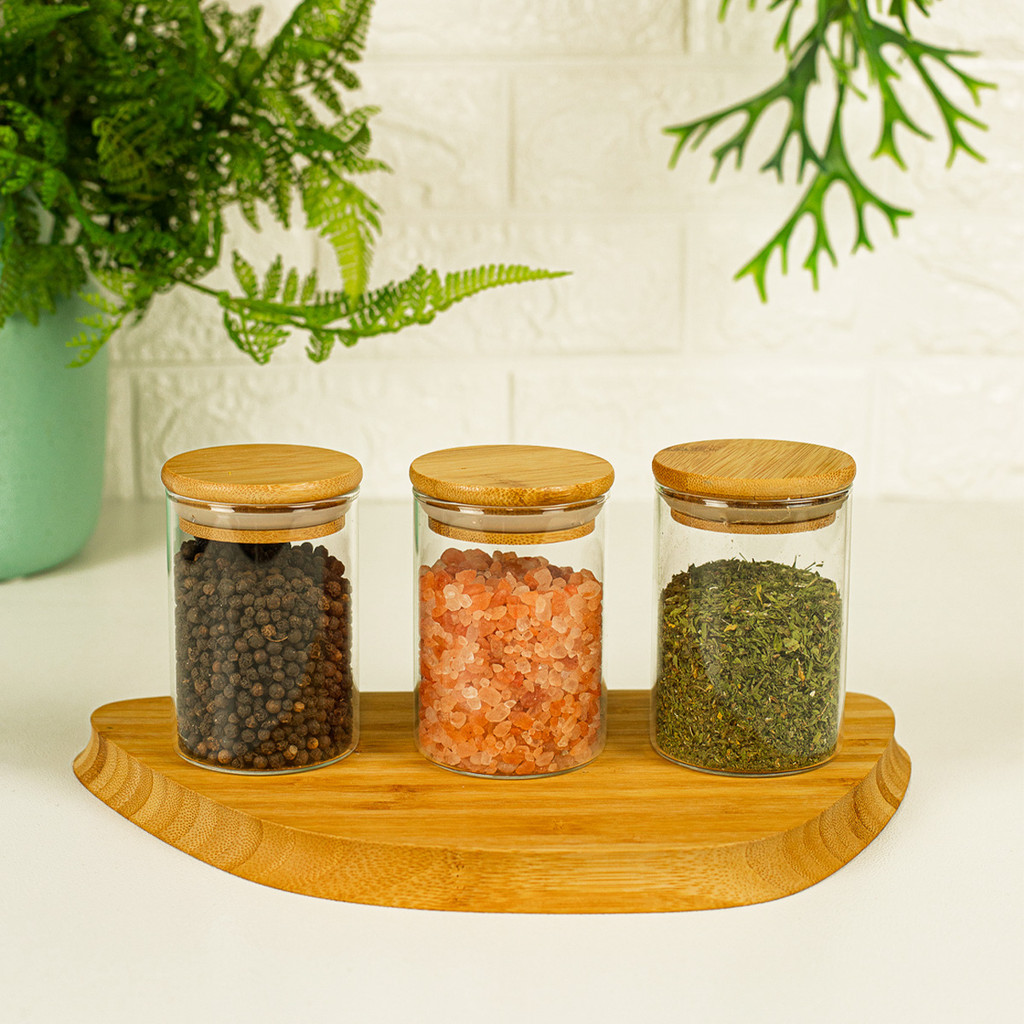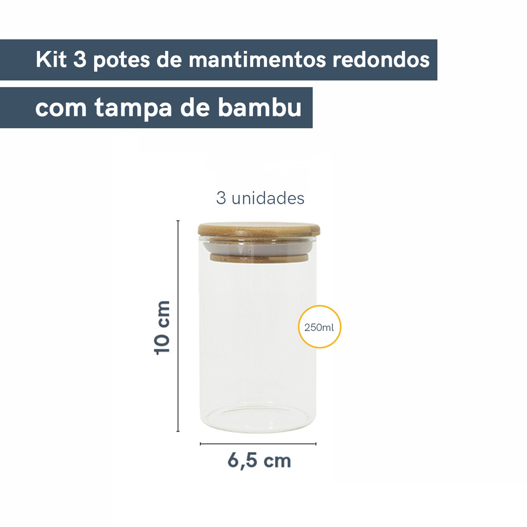 Kit 3 Potes de Vidro Hermético C/ Tampa de Bambu 250ml Oikos