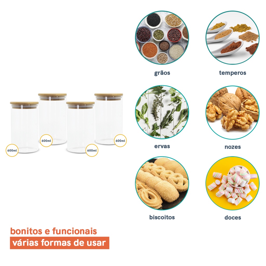 Kit 4 potes de vidro para mantimentos herméticos com tampa de bambu 600ml - Oikos