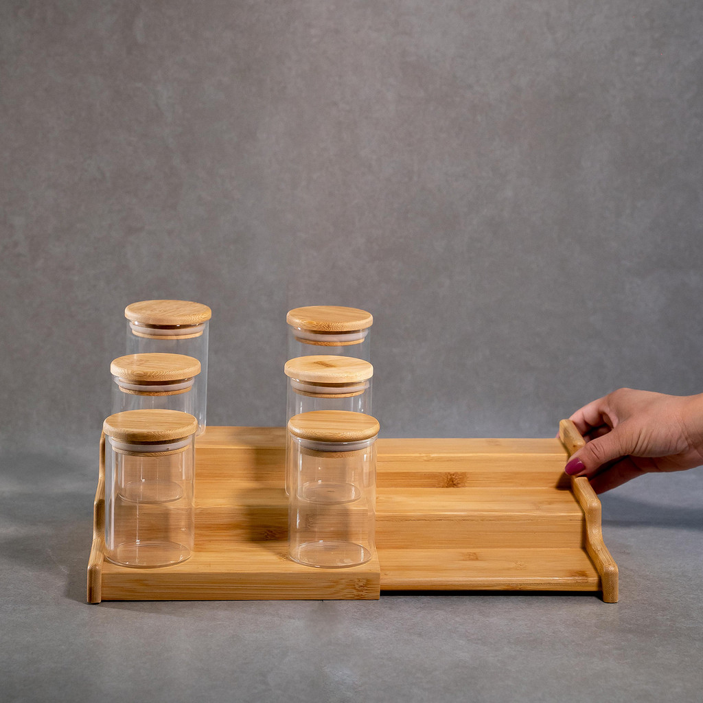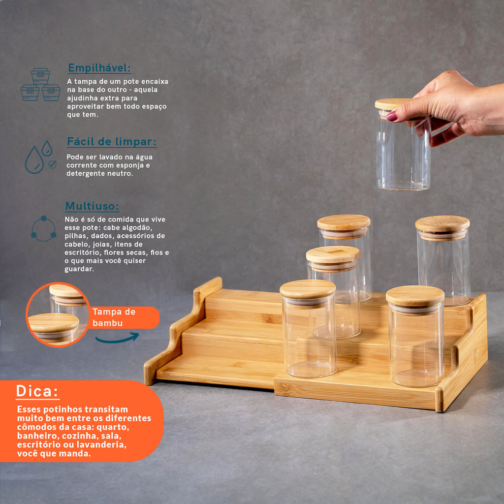 Kit 6 Potes Hermético 250ml com Tampa de Bambu E Rack Organizador de Bambu - Oikos