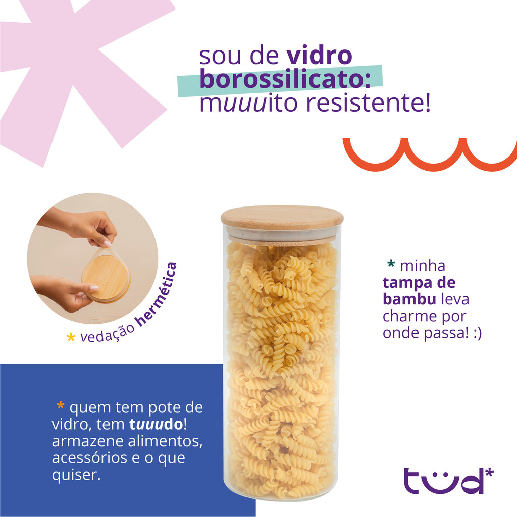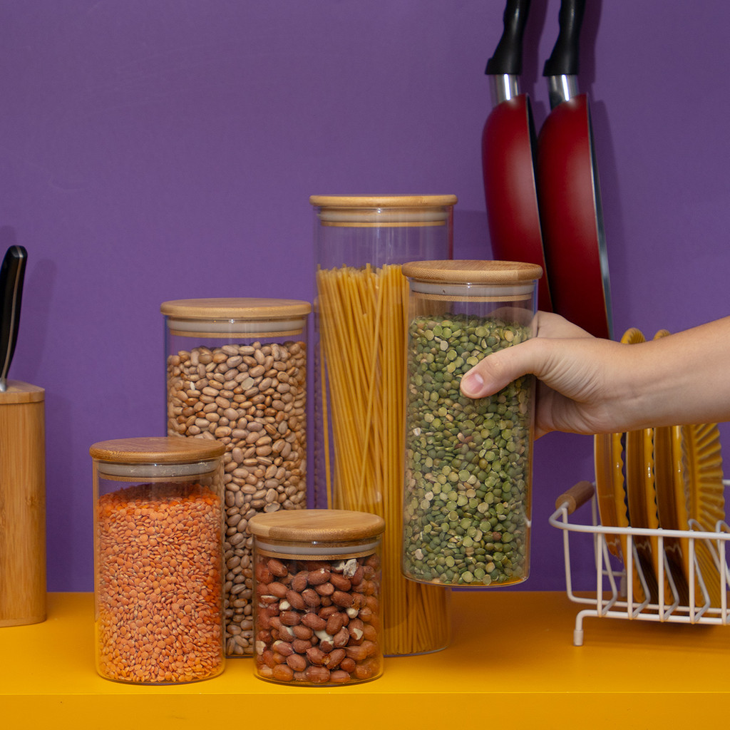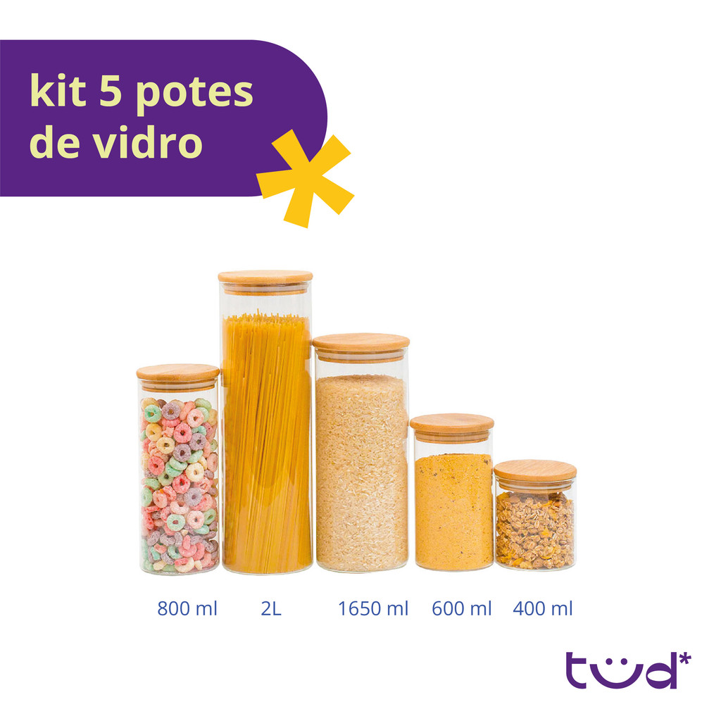 Kit de 5 potes de vidro com tampa de bambu hermético - Tüd