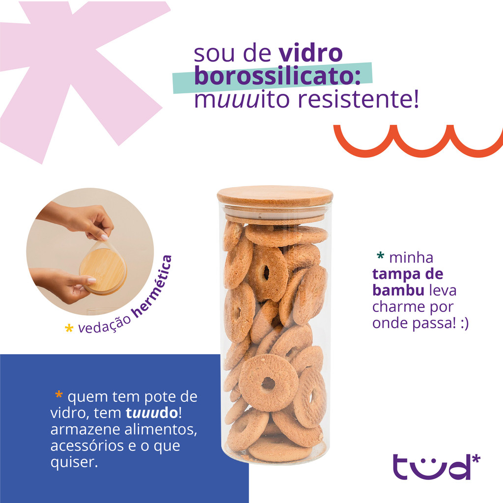 Kit 5 potes de vidro com tampa de bambu herméticos redondos - Tüd