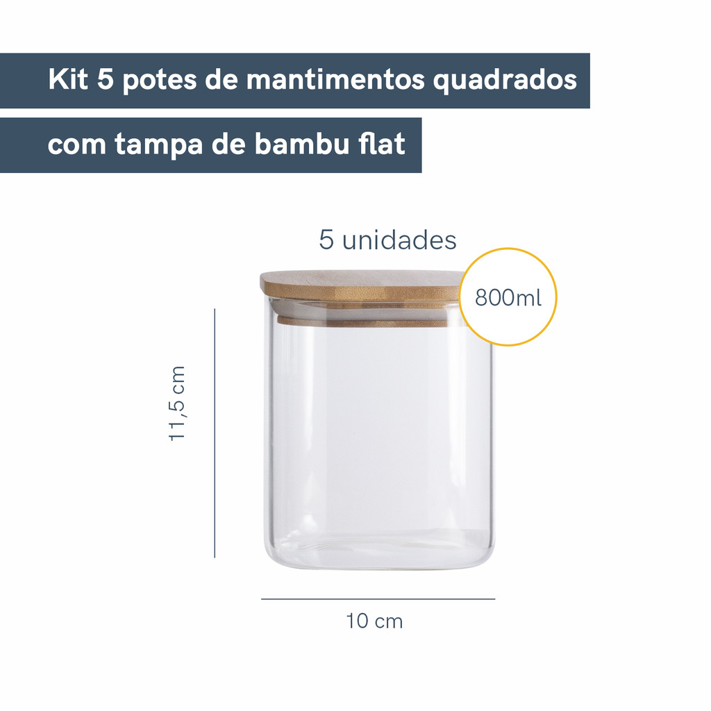 Kit Potes Hermeticos de Vidro Quad Flat Bambu 800ml - 5 pçs Oikos