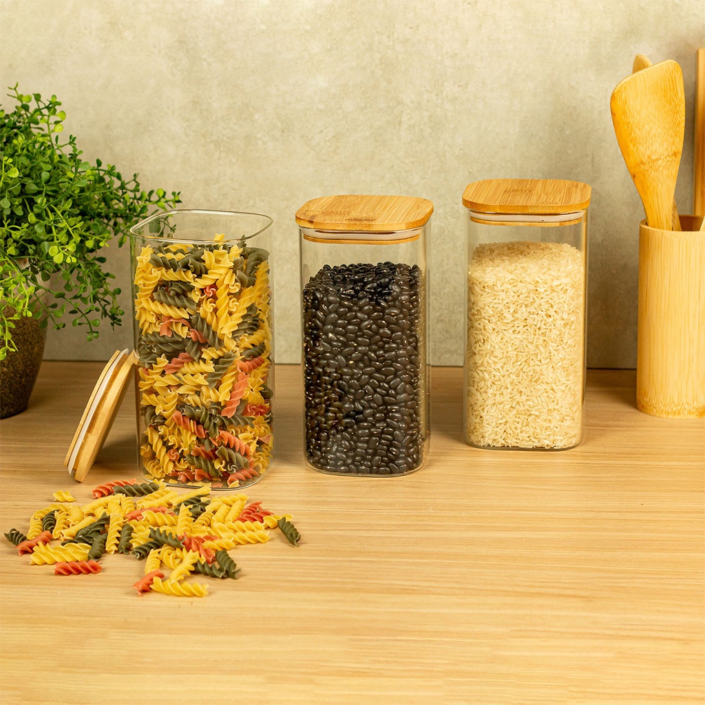 Kit 3 Potes De Vidro Tampa Bambu 1400ml Quadrado Flat - Oikos