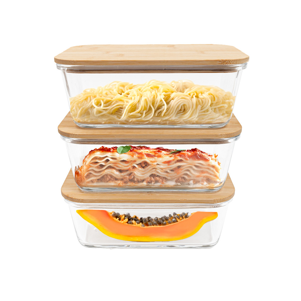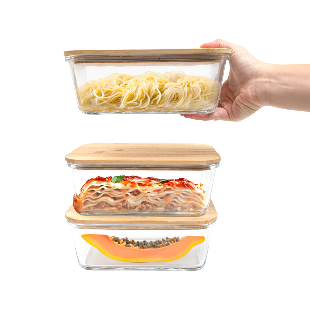 kit 3 potes de vidro 1,5L com tampa bambu hermético marmita retangulares - Tud