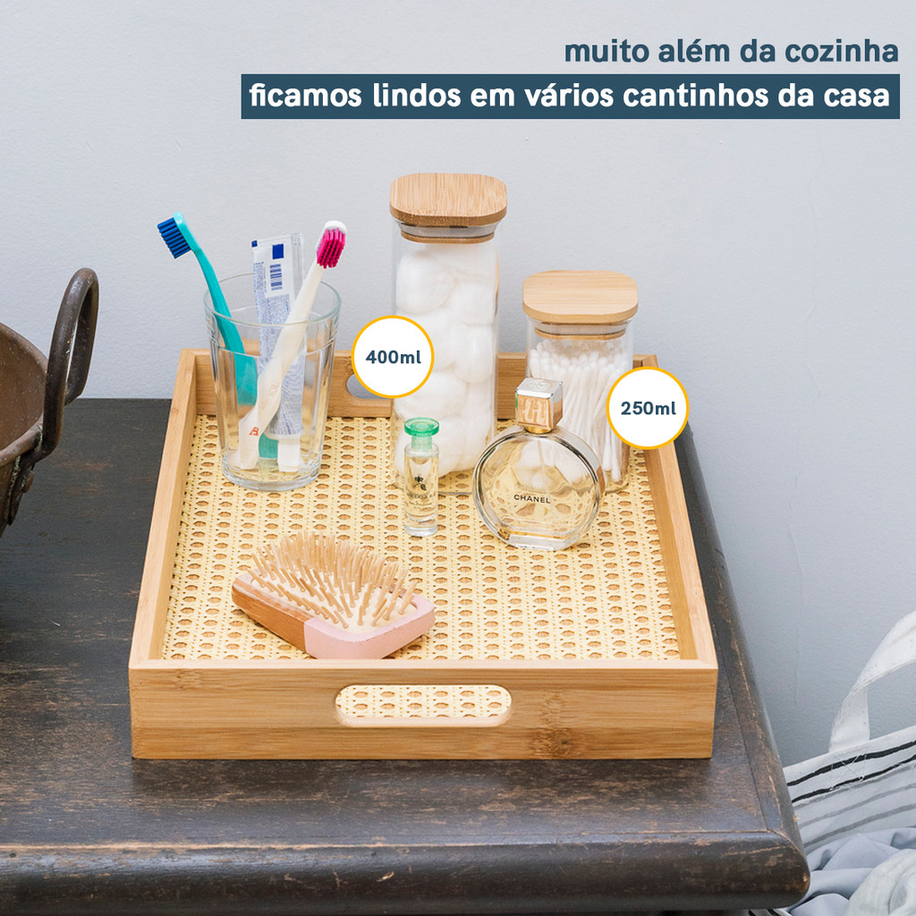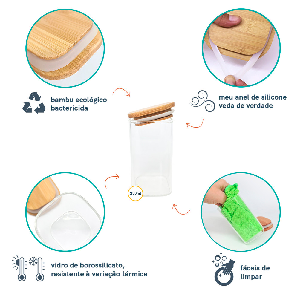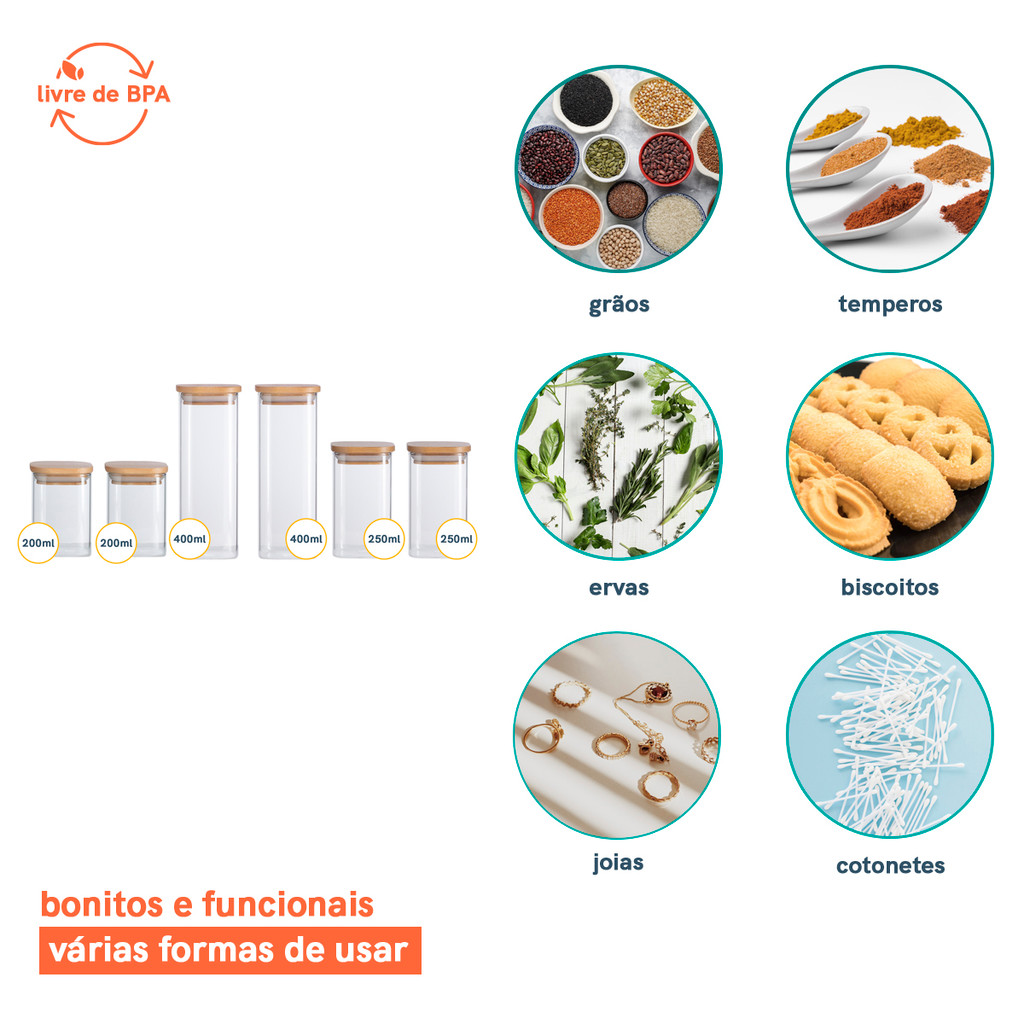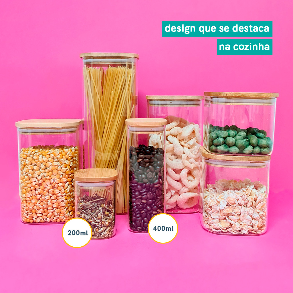 Potes de Mantimentos Quad 200/250/400ml C/Tampa Bambu - 6 Pç Oikos