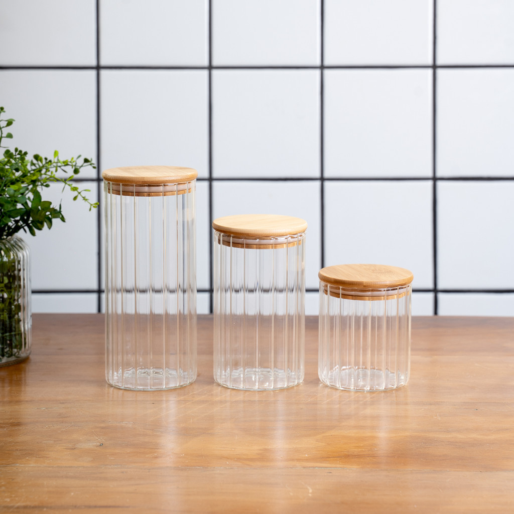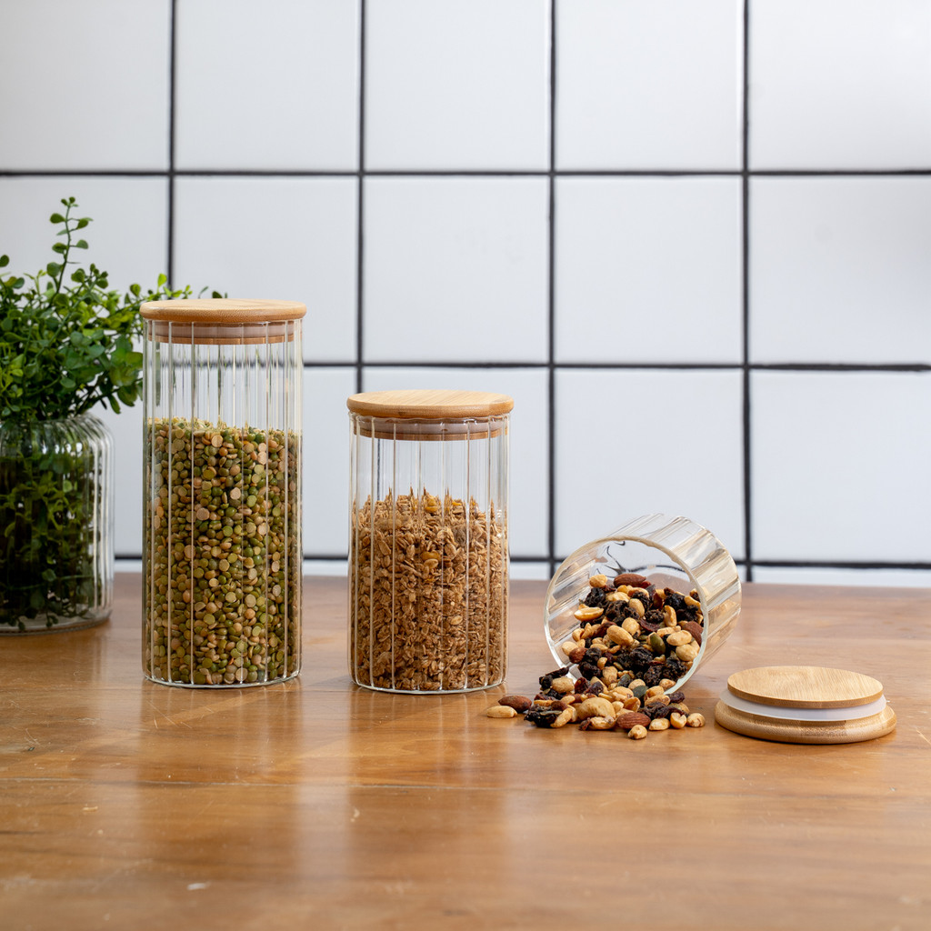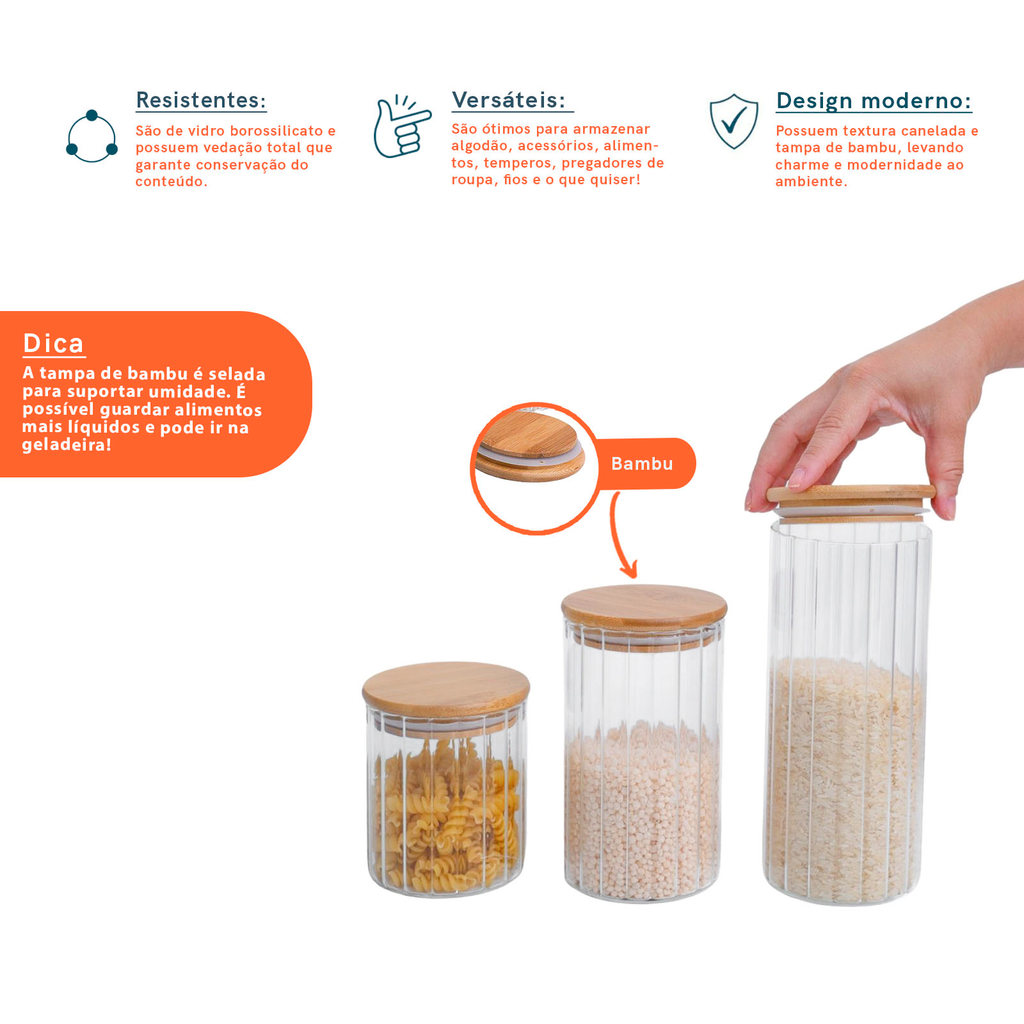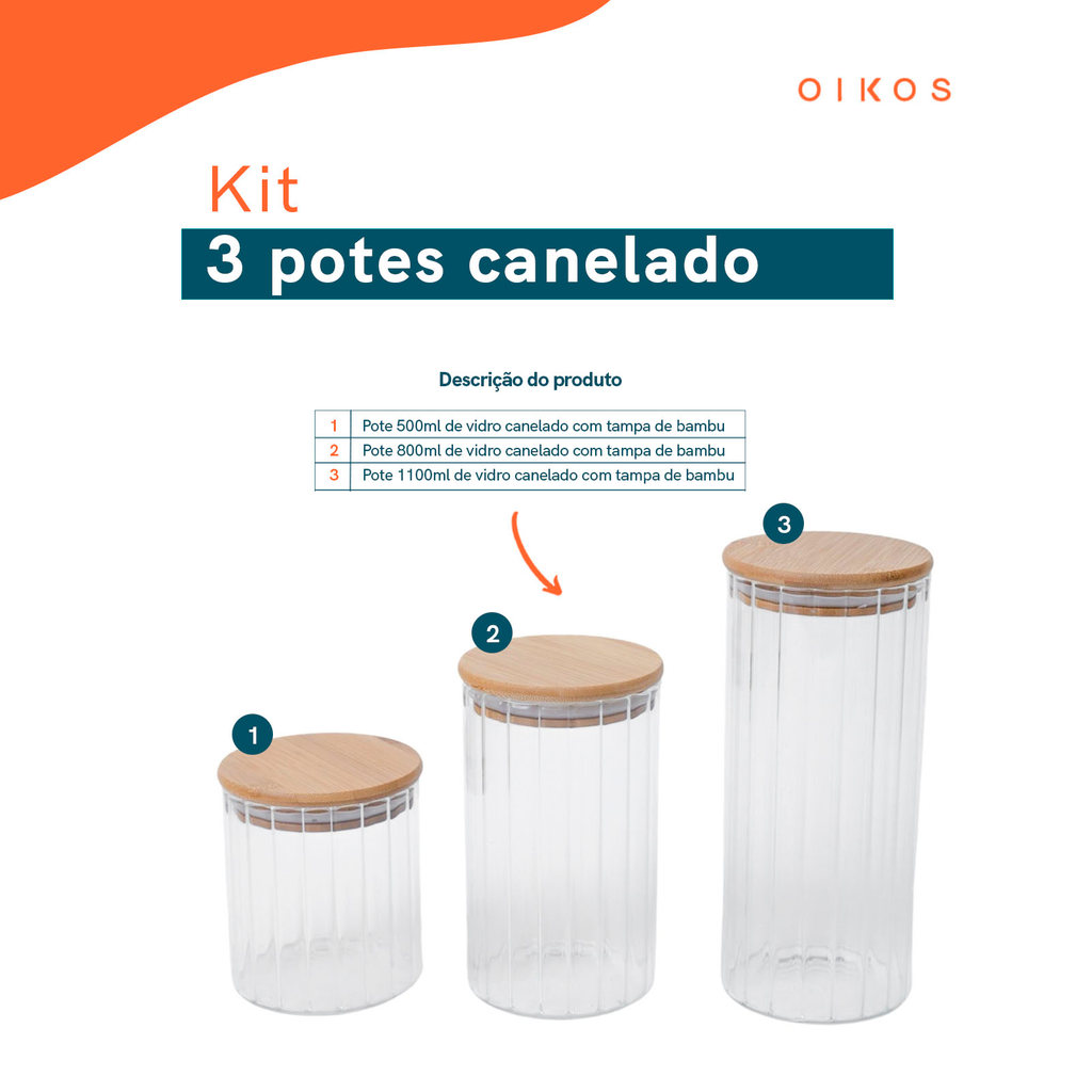 Kit 3 Potes Vidro Herméticos Para Mantimentos Canelado com Tampa de Bambu - Oikos