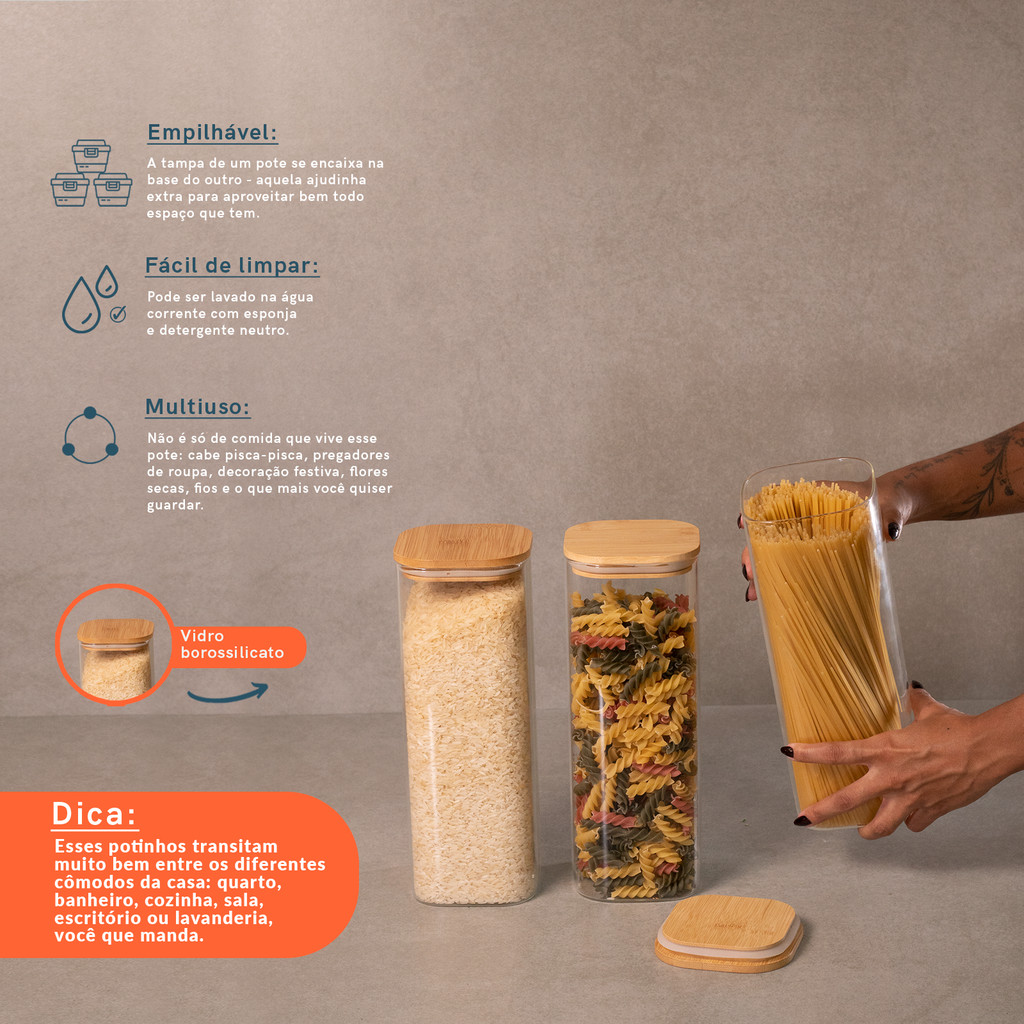 Kit de Pote Hermético de Vidro Quadrado com Tampa de Bambu 3 Peças - Oikos