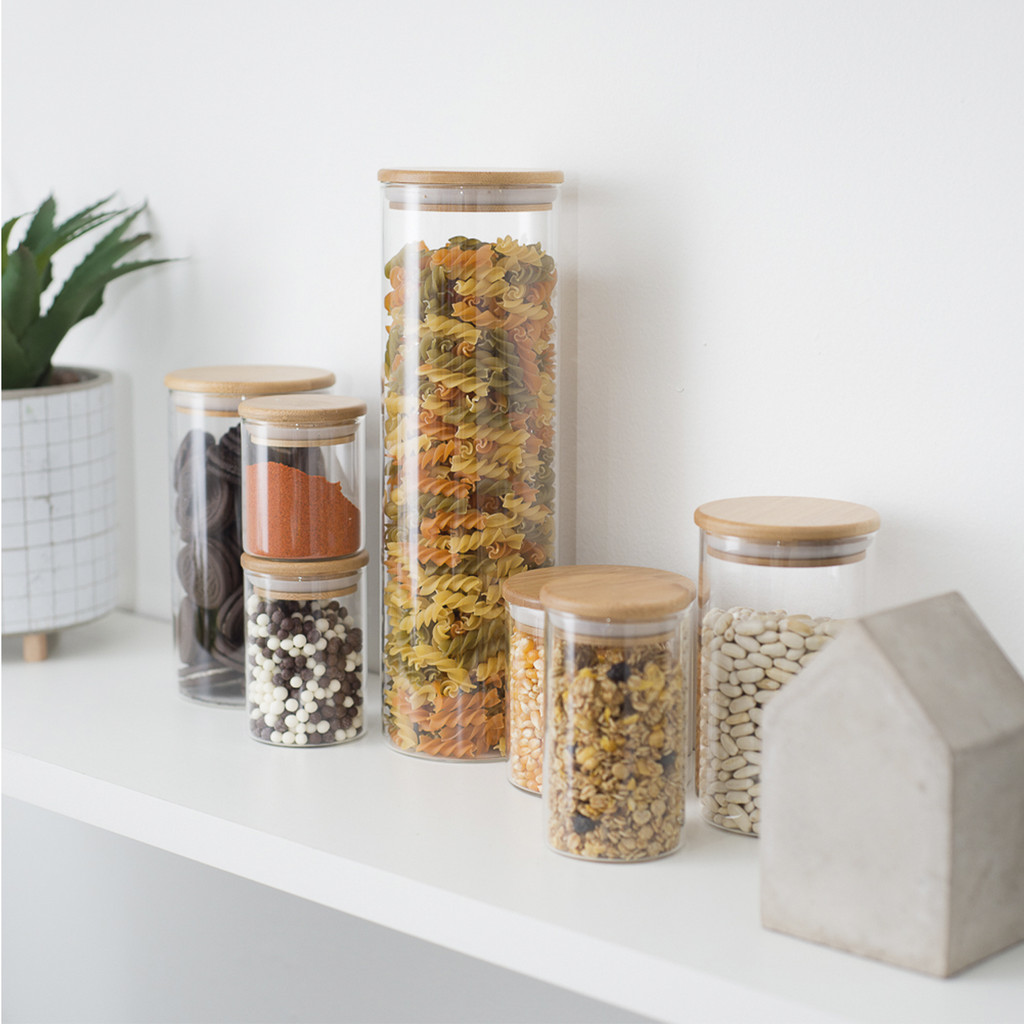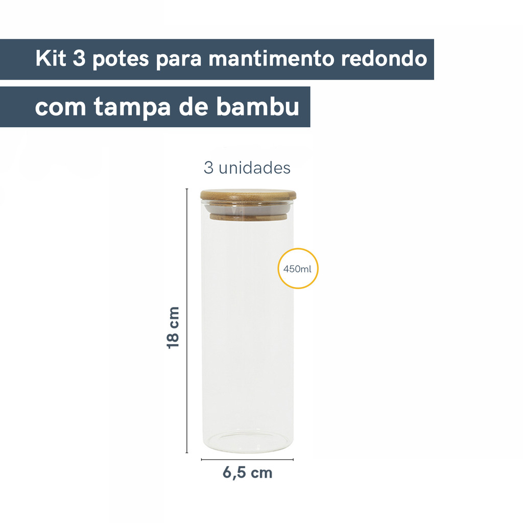 Kit 3 Potes de Vidro Hermético C/ Tampa de Bambu 450ml Oikos