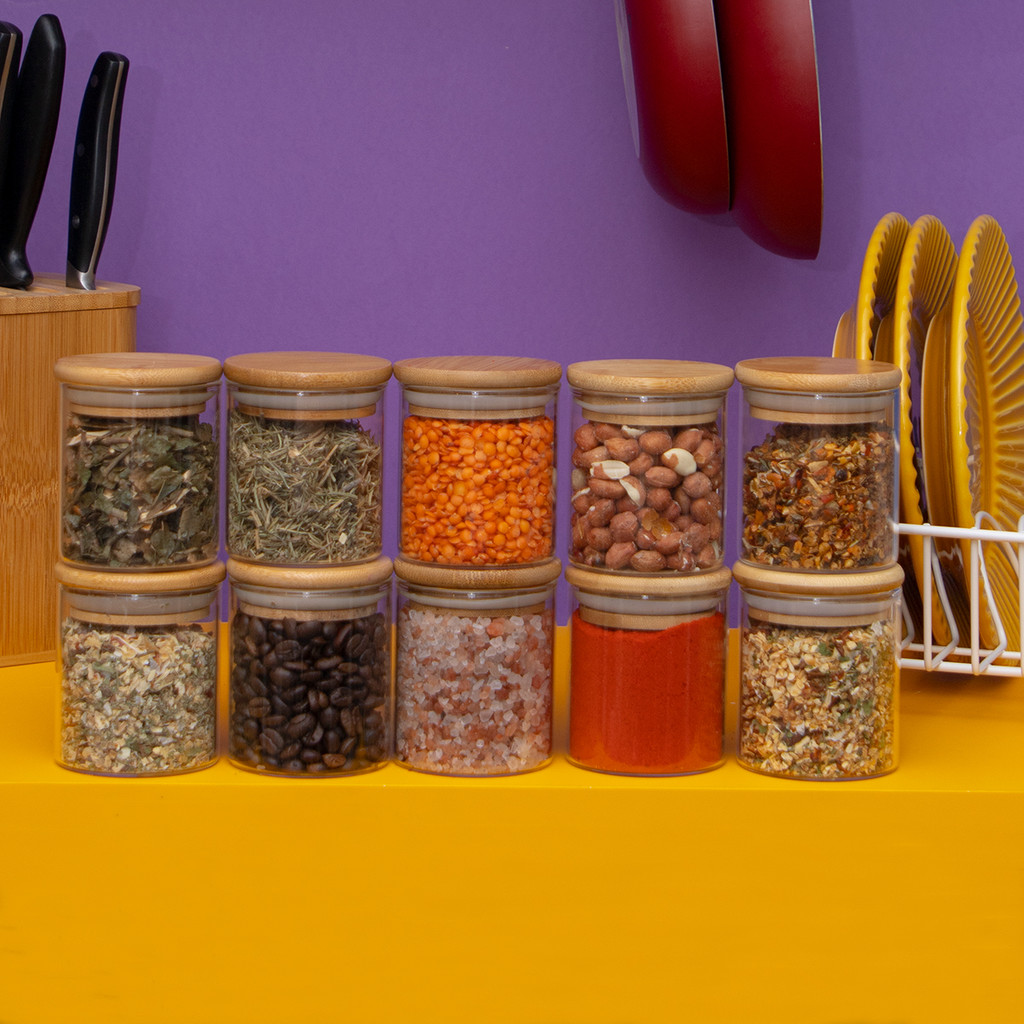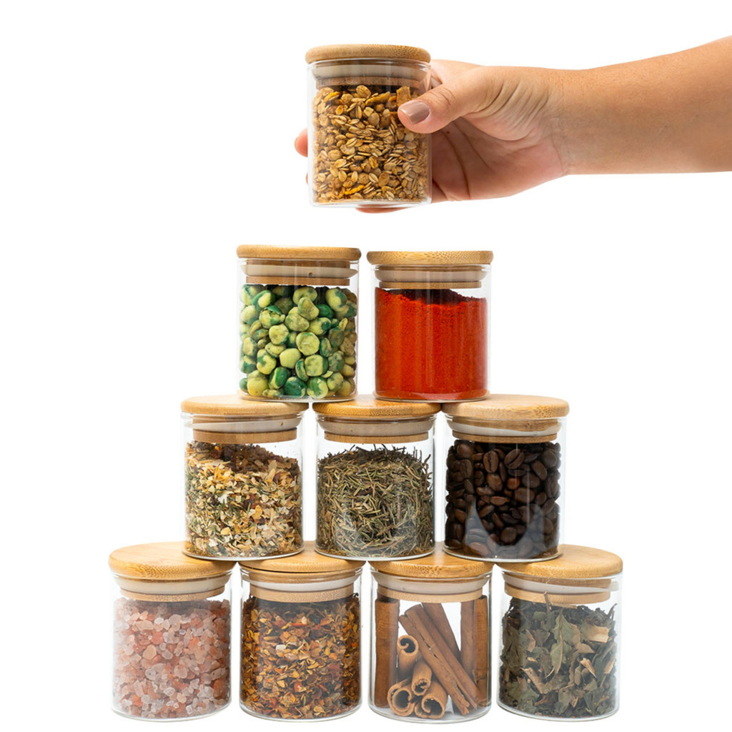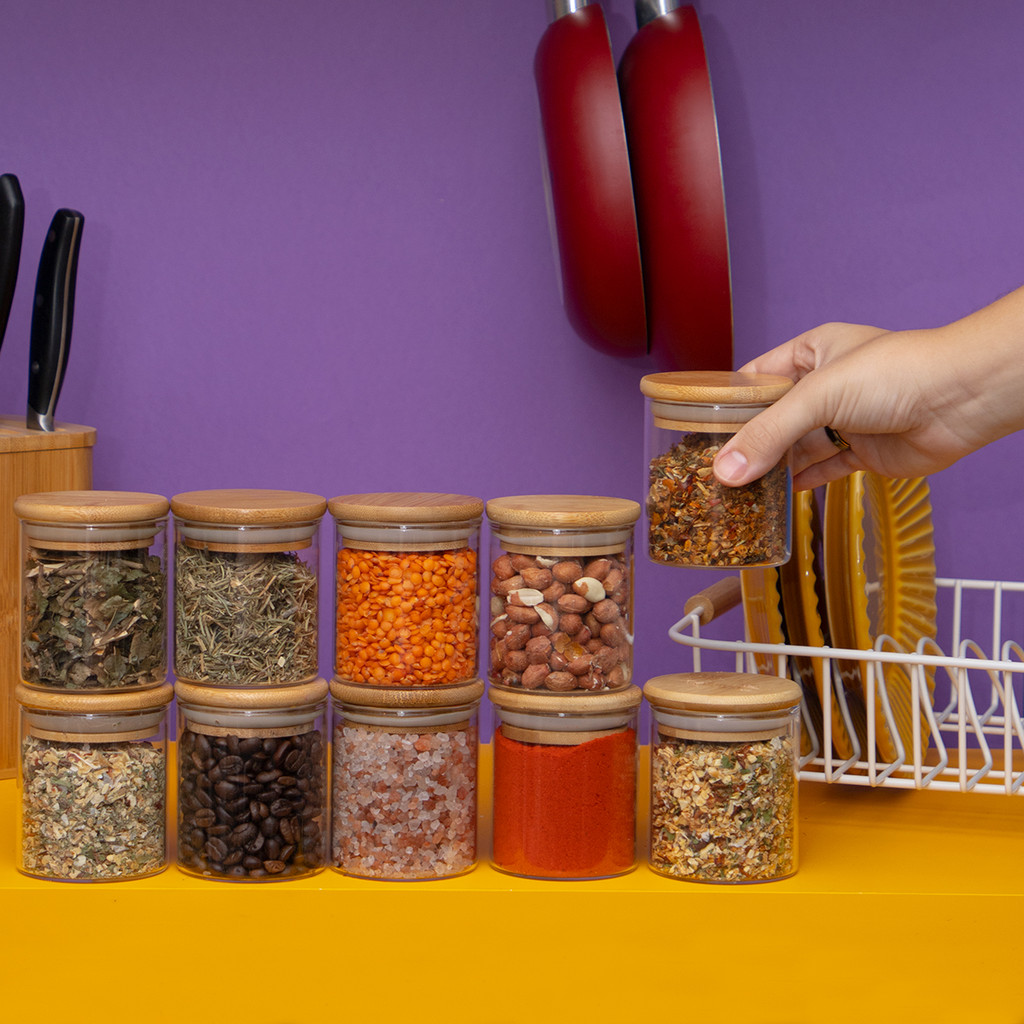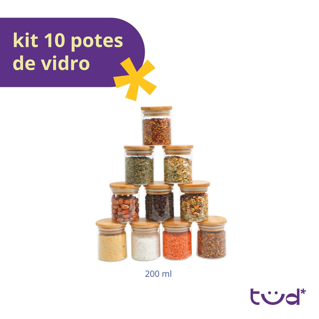 Kit 10 potes de vidro 200ml tampa de bambu herméticos redondos - Tüd