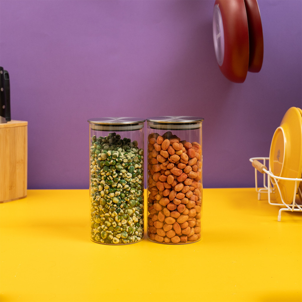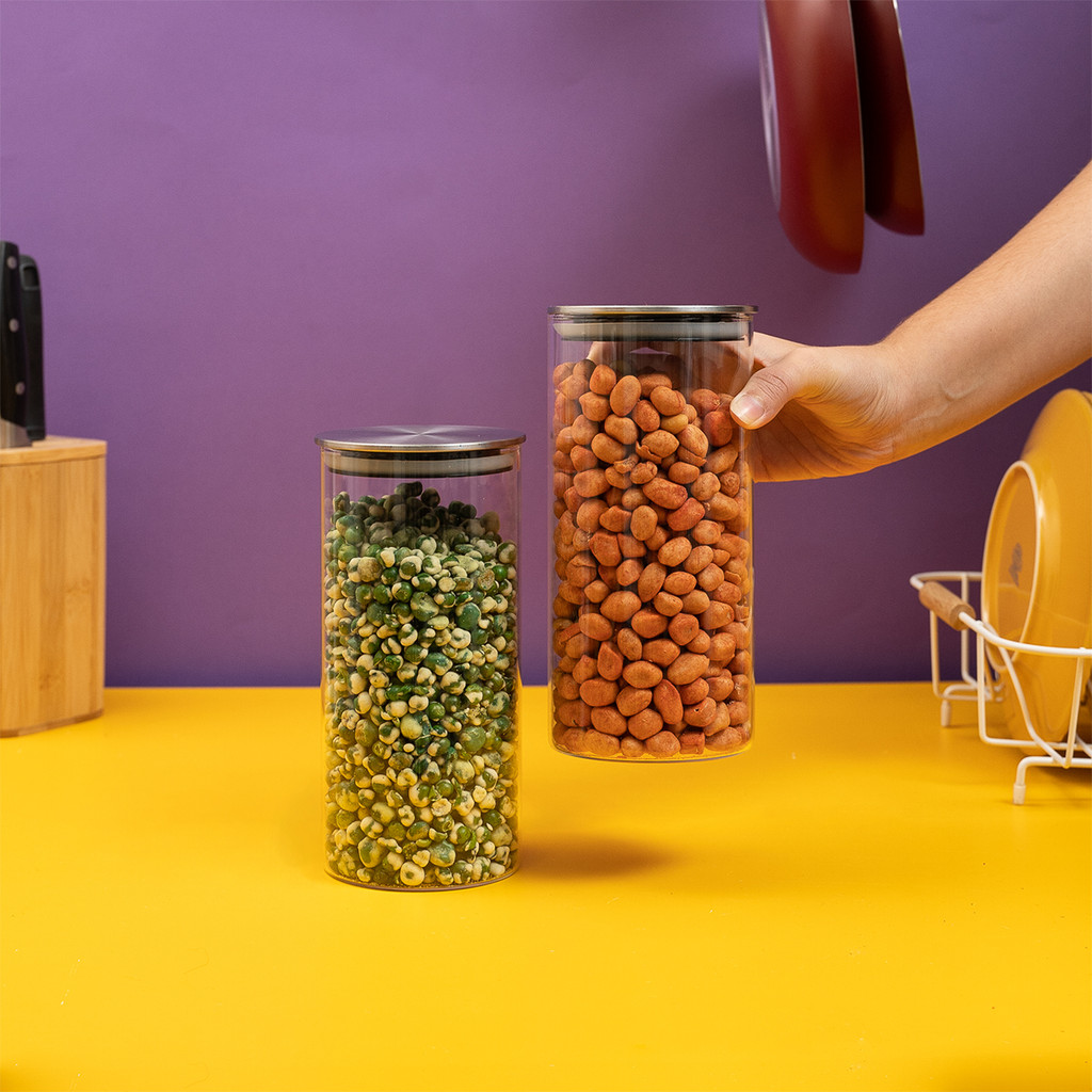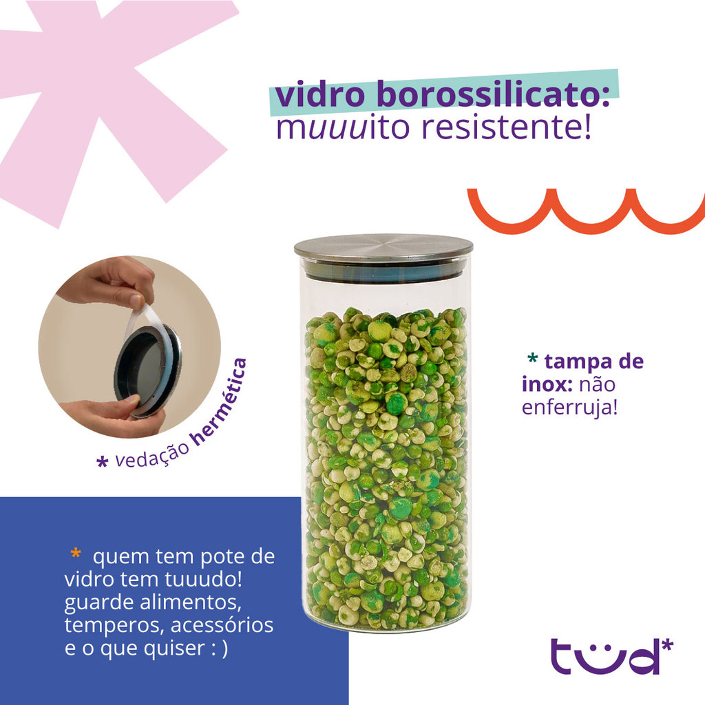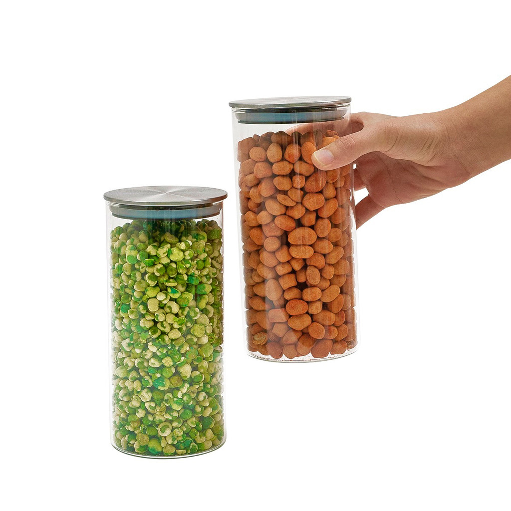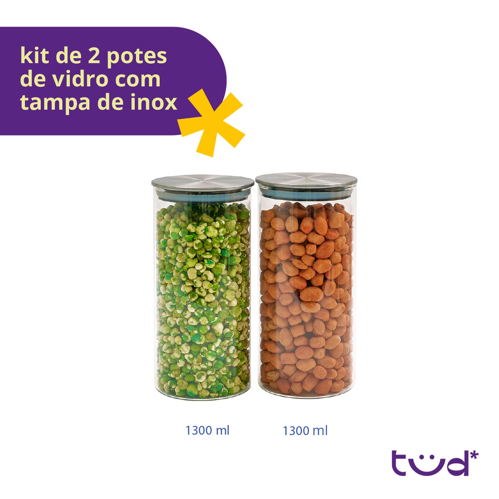 Kit 2 potes de vidro com tampa inox hermético redondo 1,3L - Tud