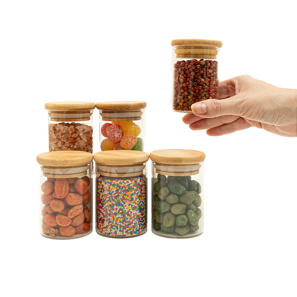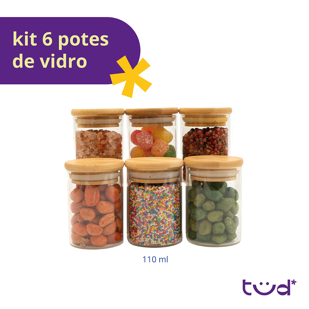 kit 6 potes de vidro 110ml tampa de bambu hermético redondos - Tud