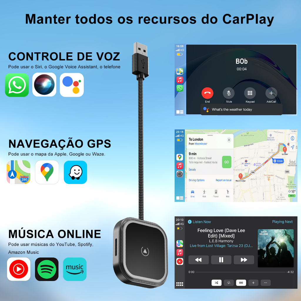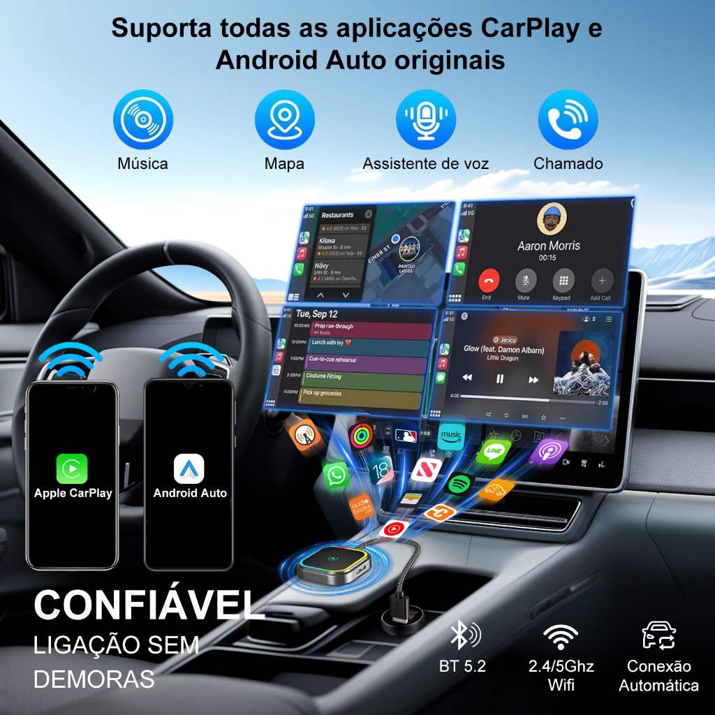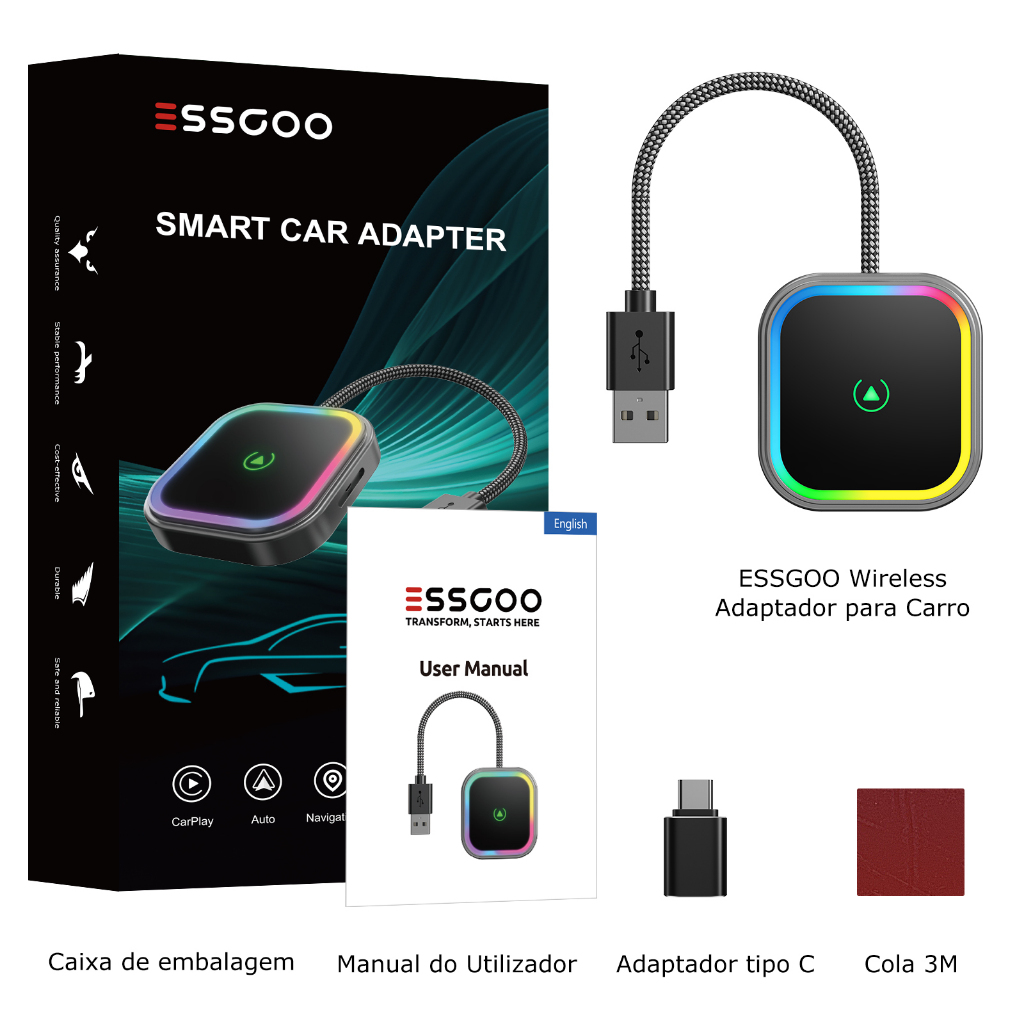ESSGOO PL8 Conversor De Adaptador Automático CarPlay/Android Sem Fio 2 Em 1 USB-A/Tipo C Portas Duplas