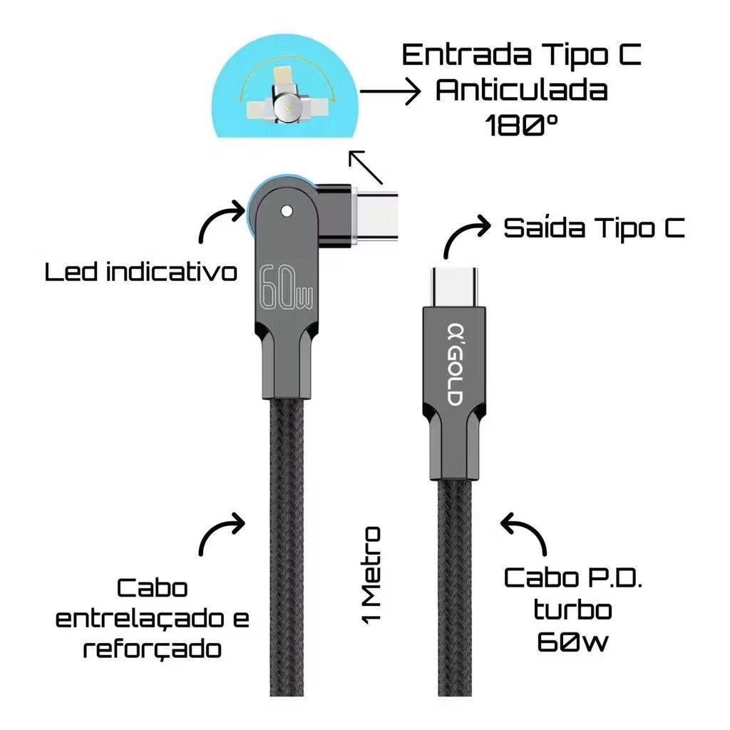 Cabo Tipo-C para Tipo-C 60W Turbo PD 1M A'Gold original 180° Com LED Revestimento Trançado Carregamento rápido