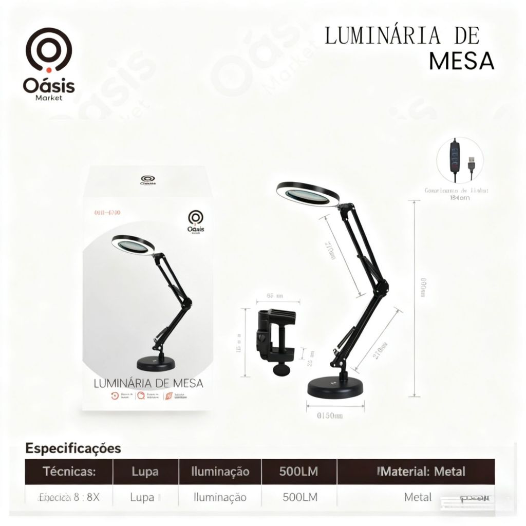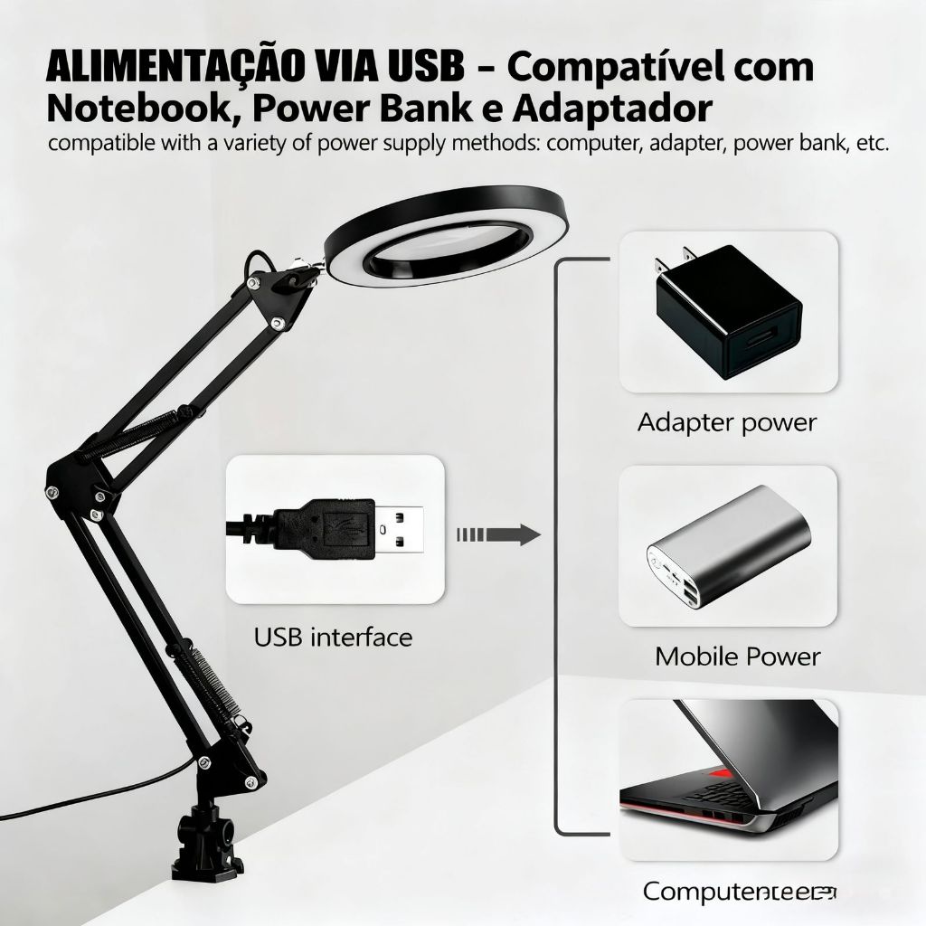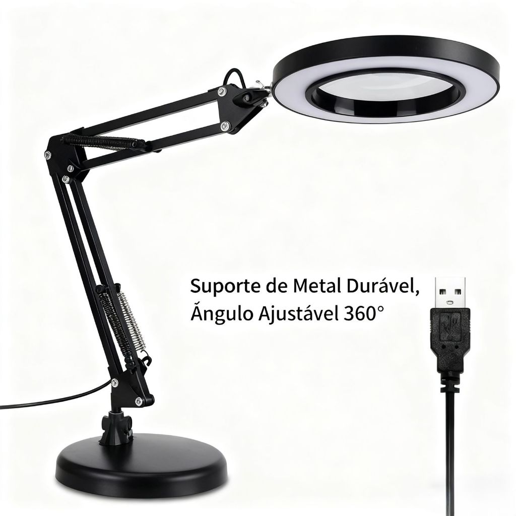 Luminária de Mesa Com Lupa 8X Iluminação LED Ring Light Ajustável para Leitura, Manicure e Detalhes