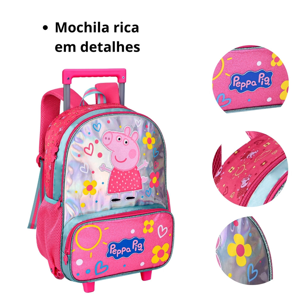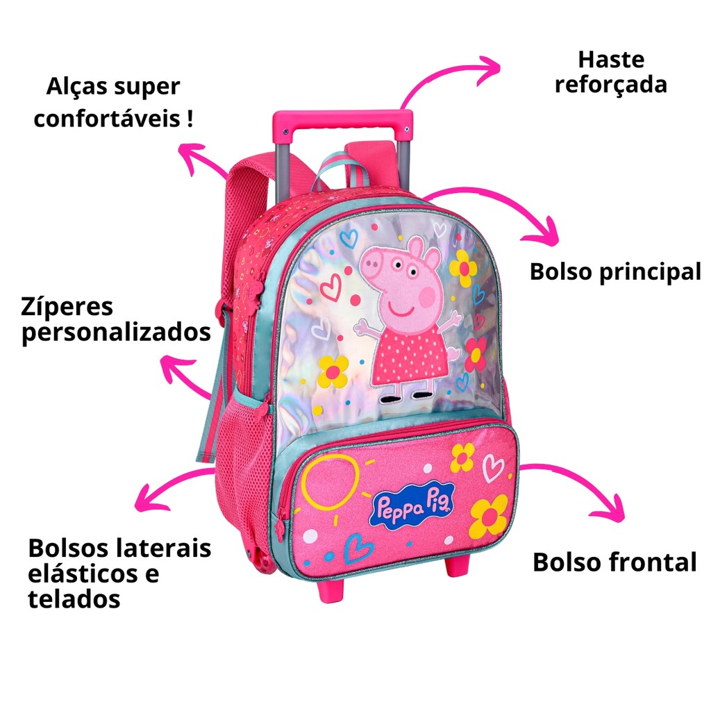 Mochila De Rodinha Peppa Pig Holográfica Com Alças Ajustáveis Ideal Para Escola/ Passeio Infantil Desenho Animado - Clio