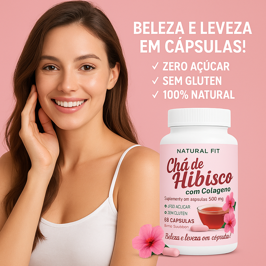 "Chá de Hibisco com Colágeno – Zero Açúcar, Sem Glúten, 60 cápsulas. Pele firme, leveza, beleza e resultado rápido!"