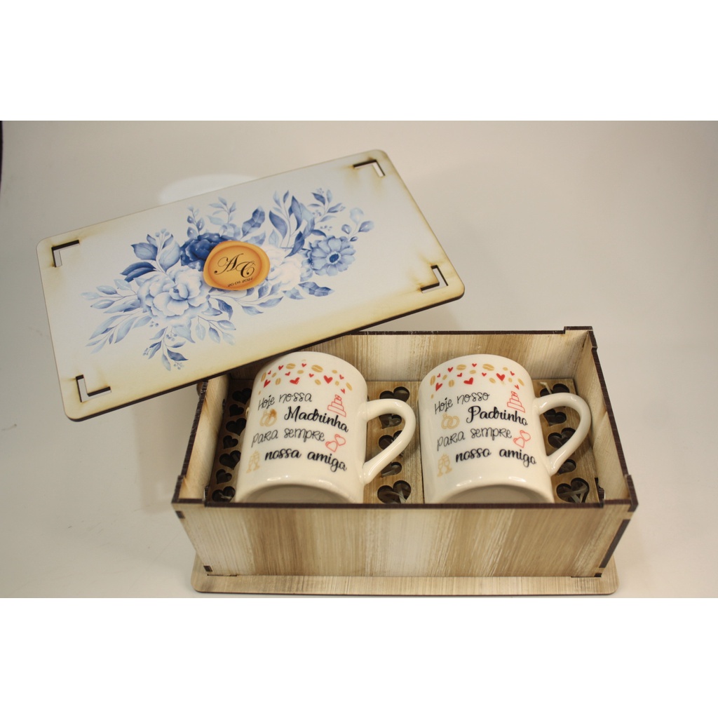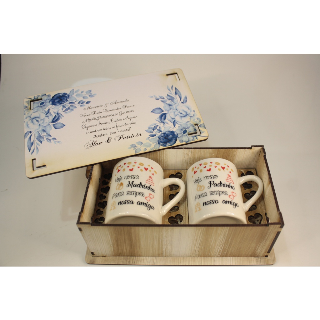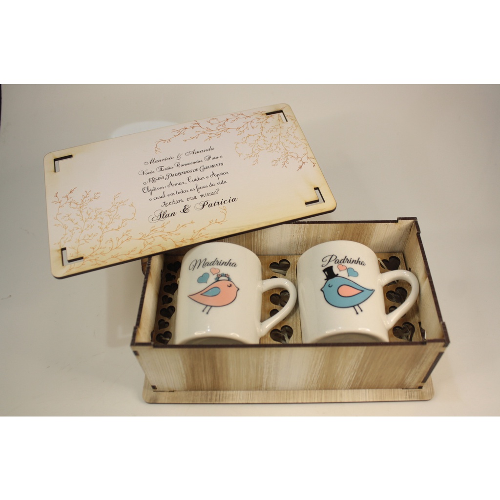 Casamento Padrinhos e Pais caixa rústica MDF Personalizada com 2 canecas porcelana
