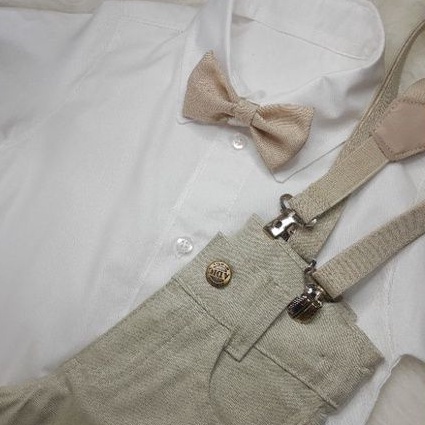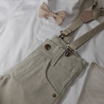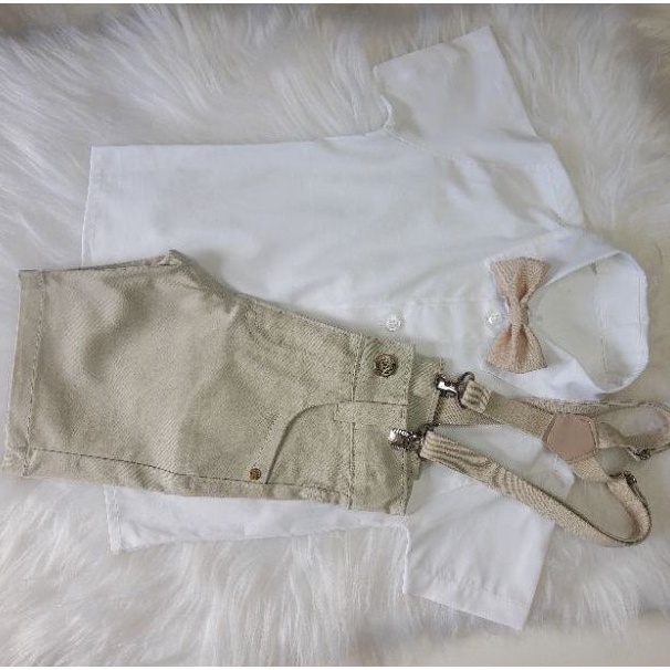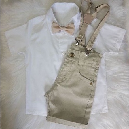 Conjunto Batizado Casamento Nude Liso - Camisa, Bermuda, Suspensório+Gravata - Festa, Evento