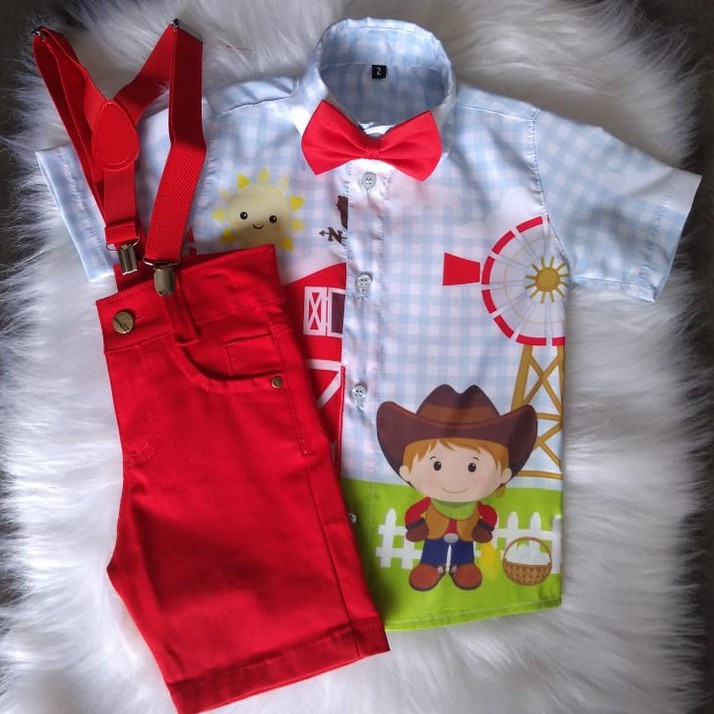 Conjunto Temático Fazendinha Completo Infantil Camisa Short Suspensório e Gravata Tecido de Altíssima Qualidade