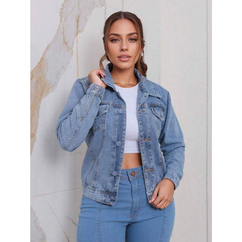 Jaqueta Jeans Feminina casaco manga longa Lavagem Clara botao ferro