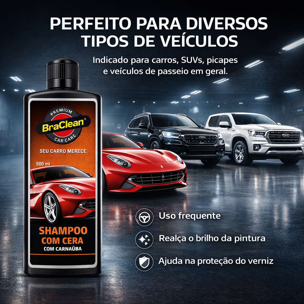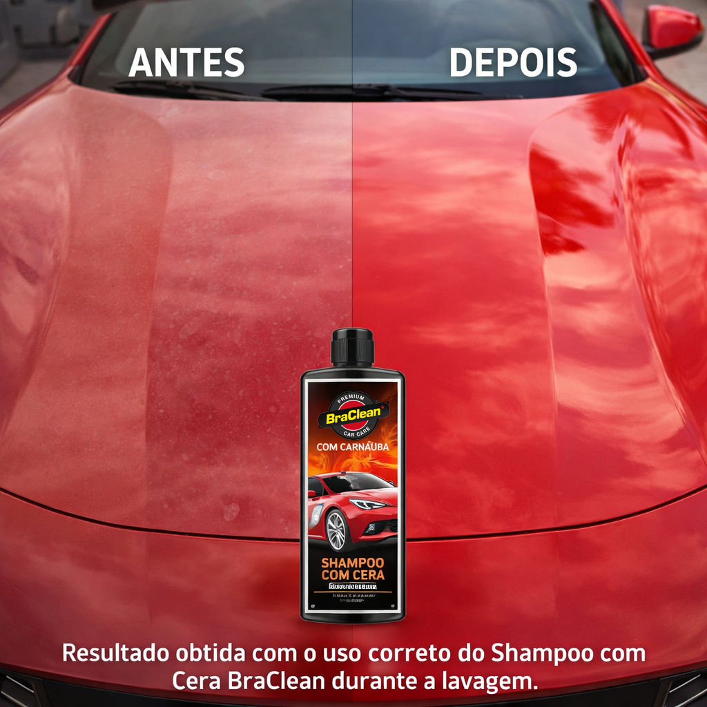 Melhor Shampoo com Cera 500ml lavagem automotiva acabamento rápido após secagem BraClean