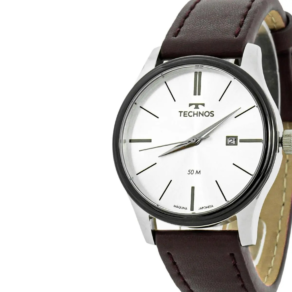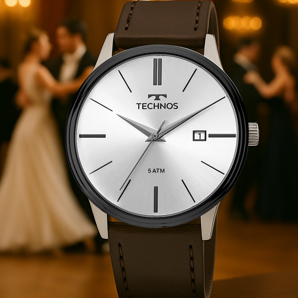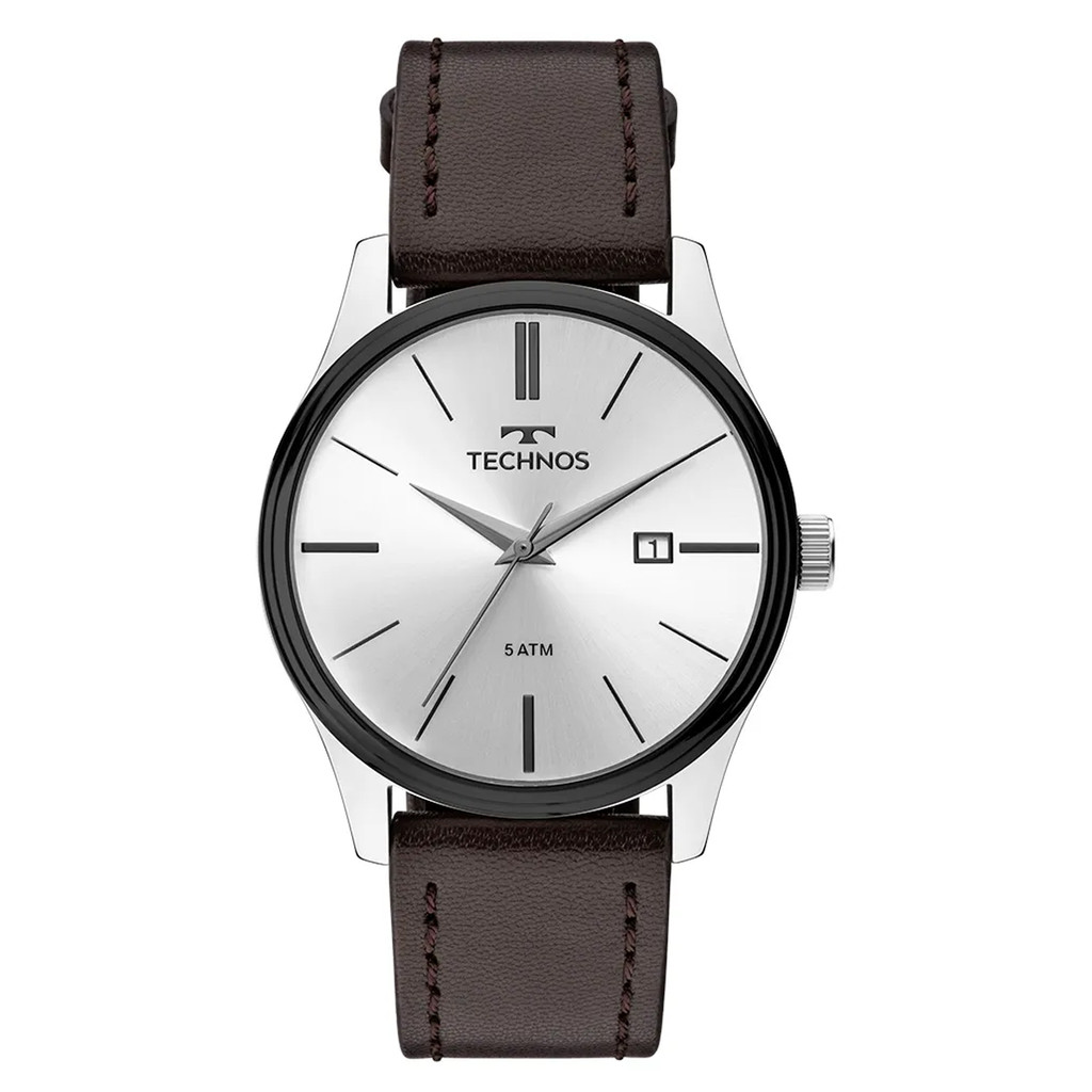 Relógio Pulso Masculino Technos 2115MPP1K Steel Prata Fundo Prata Analógico Pulseira Couro Prova D'àgua Lente Cristal