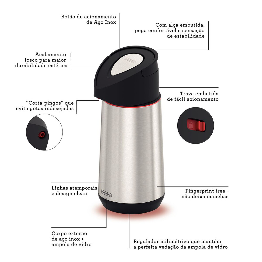 Garrafa Térmica 1,2 L Tramontina Exata Café Água Aço Inox Quente Frio Ampola de Vidro Bomba