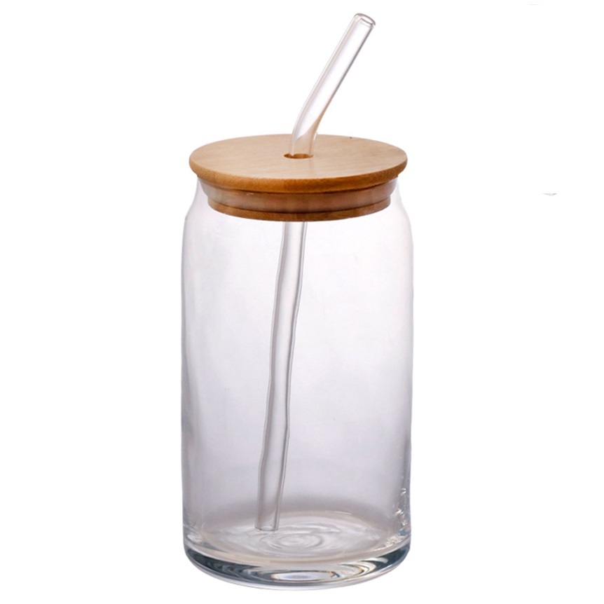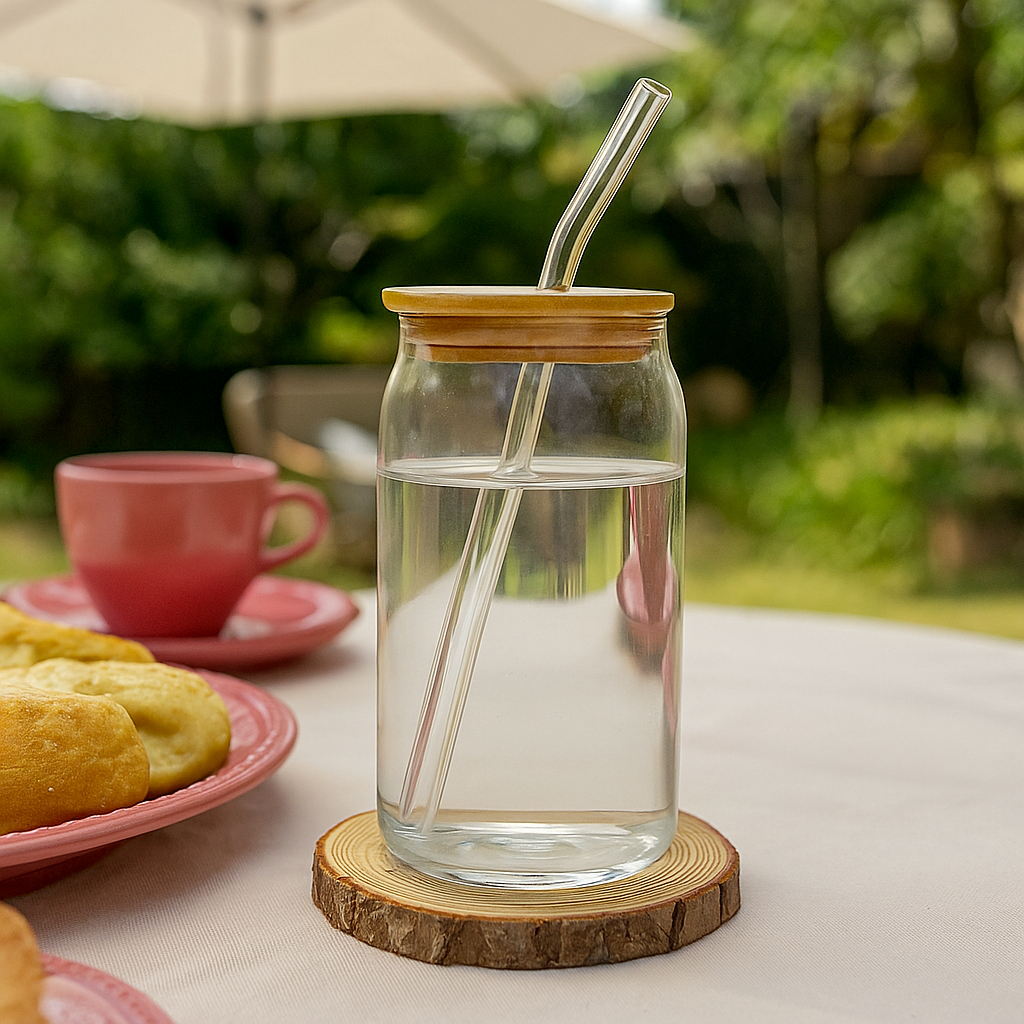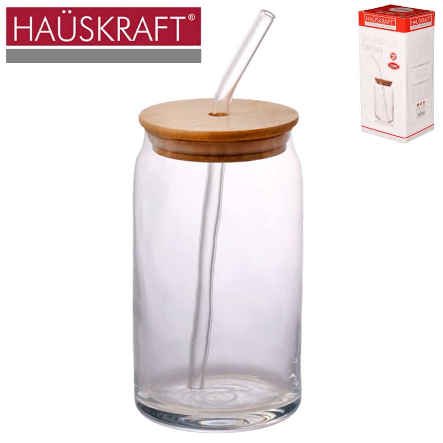 Copo de Vidro Formato Lata com Canudo + Tampa Hermética de Madeira/Bambu – 500ml | Hauskraft