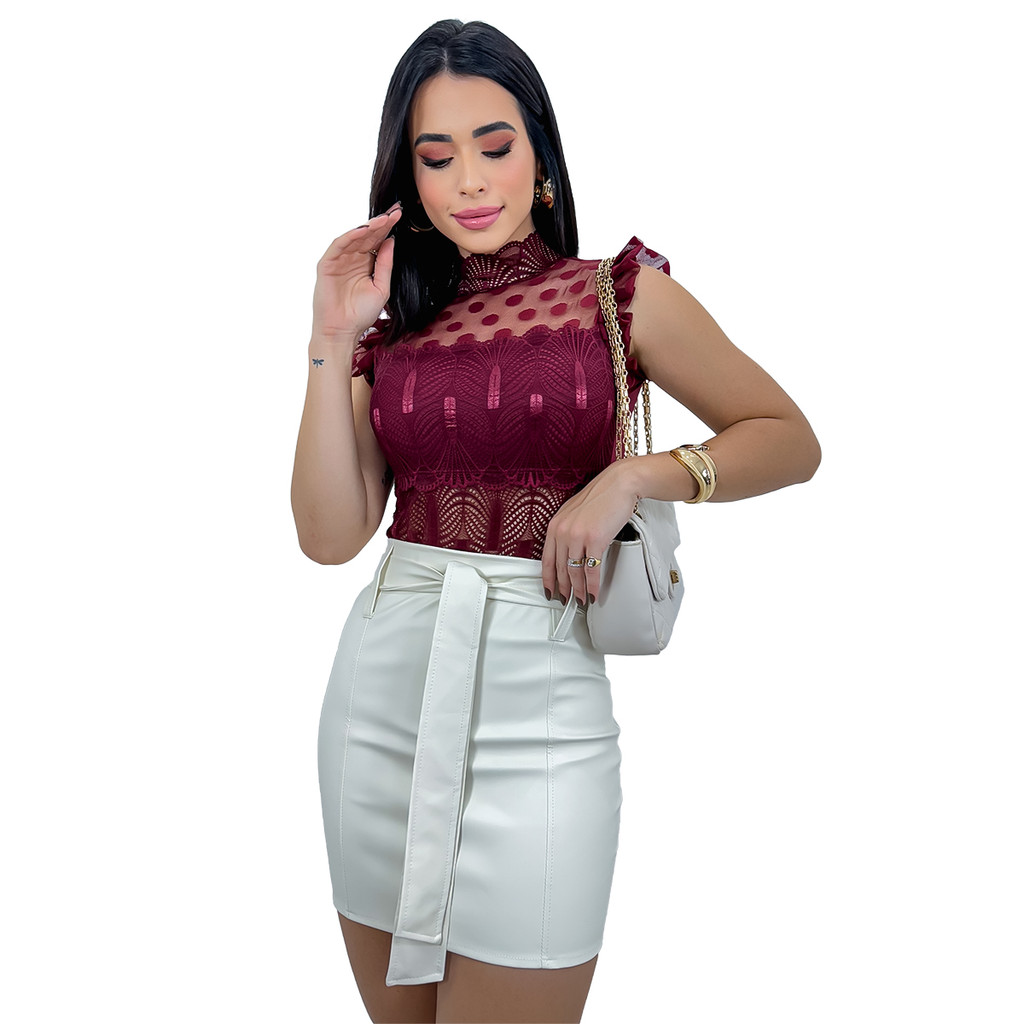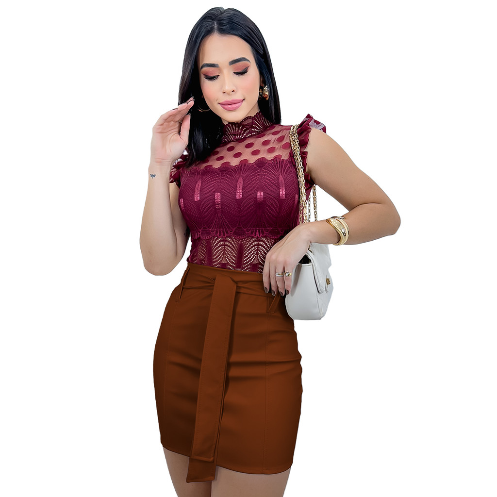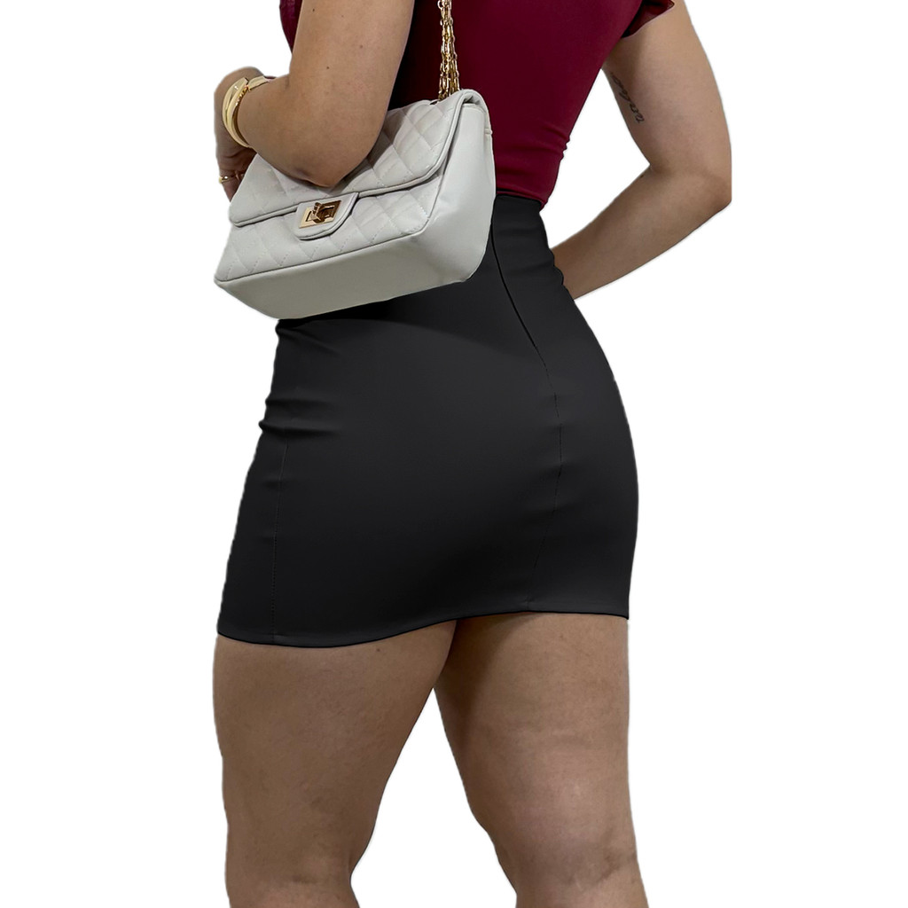 Saia Curta Feminina Couro Fake Social Festa De Amarrar Laço
